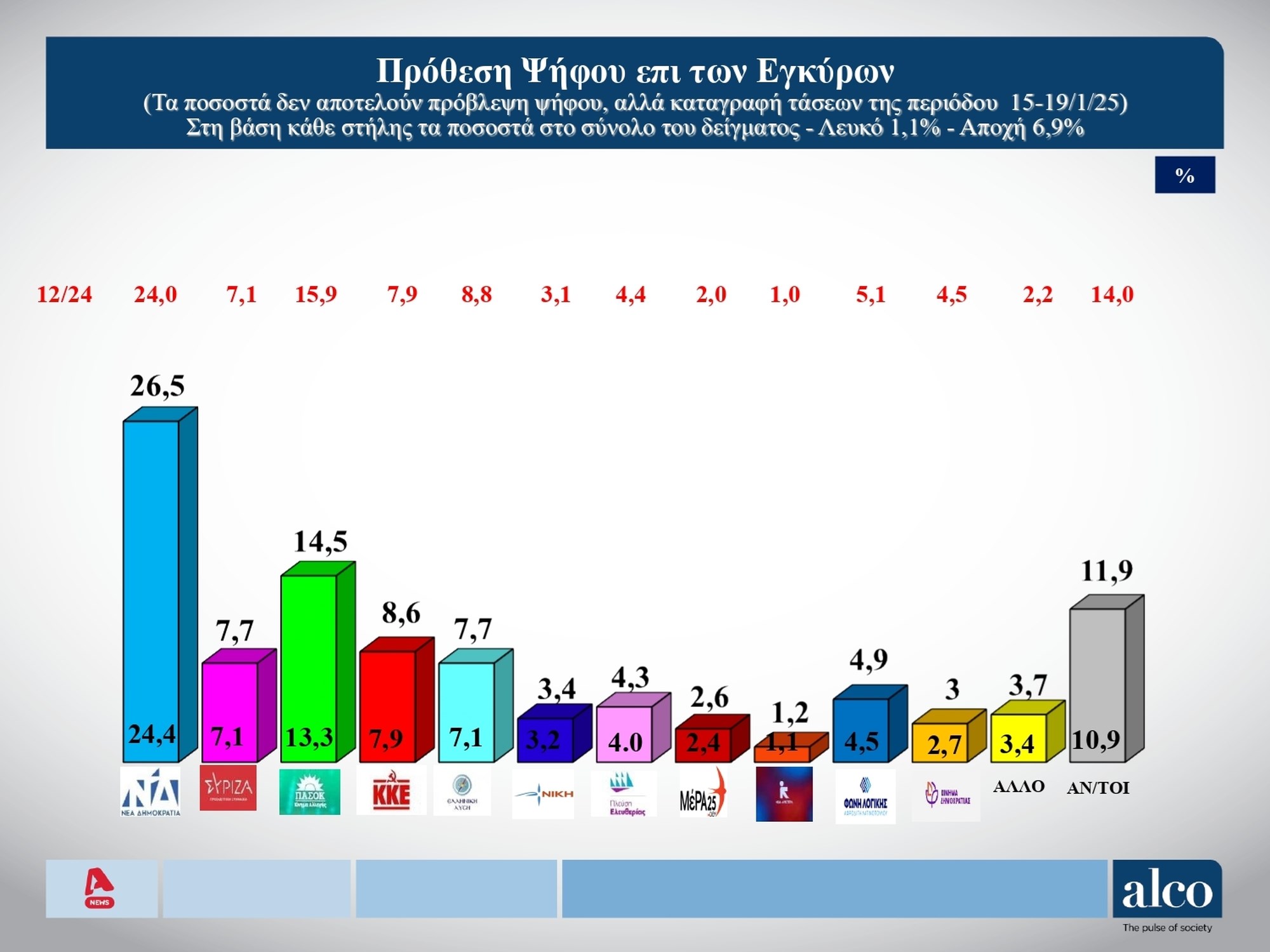 Στο πολιτικό σκέλος, η ΝΔ διατηρεί προβάδισμα 12% έναντι του ΠΑΣΟΚ. Το κυβερνών κόμμα ενίσχυσε τα ποσοστά του κατά 2,5 μονάδες σε σχέση με την προηγούμενη έρευνα, φτάνοντας το 26,5%. Την ίδια ώρα, η αξιωματική αντιπολίτευση έπεσε στο 14,5%, με το ΚΚΕ να ακολουθεί τρίτο με 8,6%.