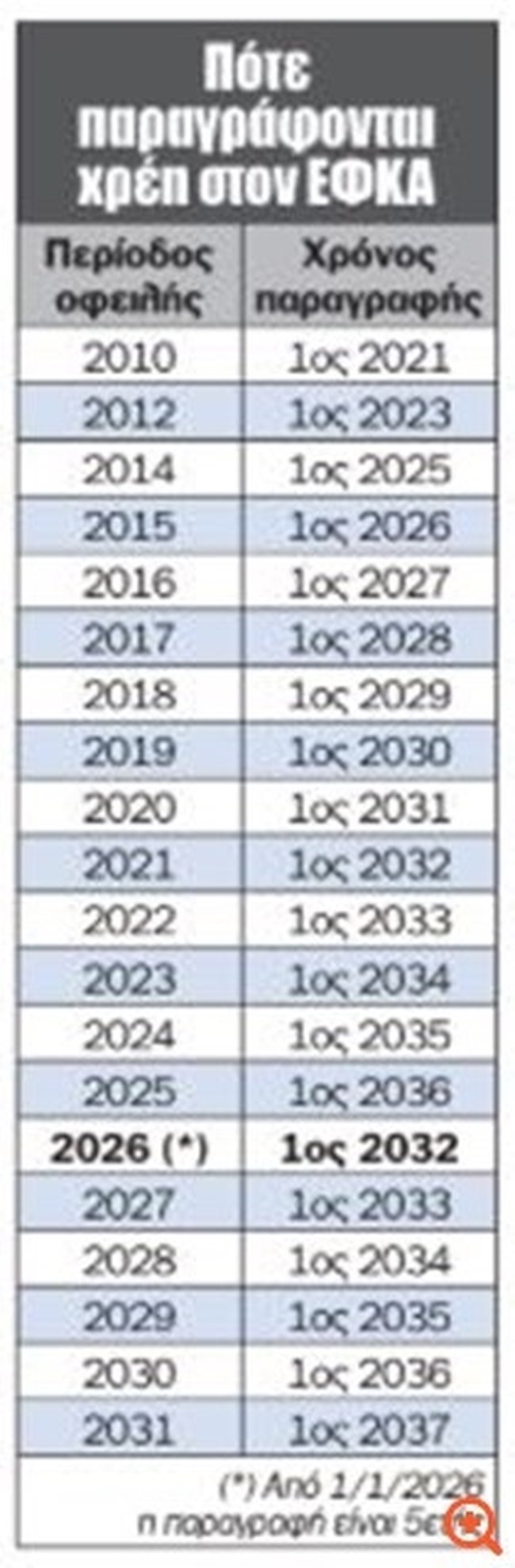 Τα χρέη που ανάγονται σε περιόδους καταβολής εισφορών πριν από το 2026 εξακολουθούν να υπόκεινται σε 10ετή παραγραφή ακόμα και αν εντοπιστούν για πρώτη φορά μετά την 1/1/2026, ενώ στη συνέχεια θα υπόκεινται σε 5ετή παραγραφή.