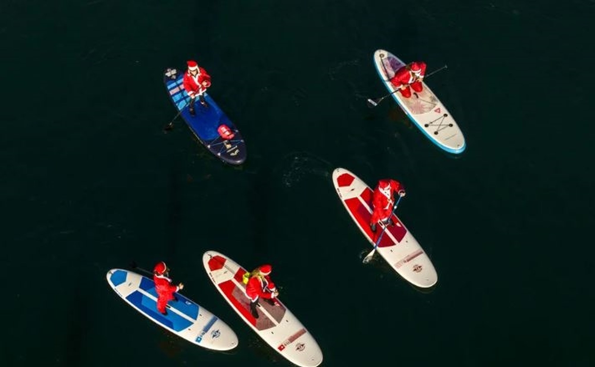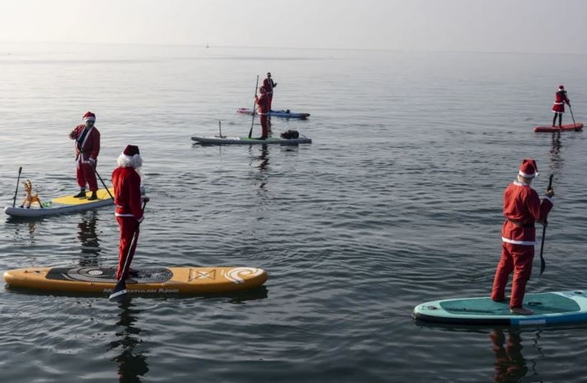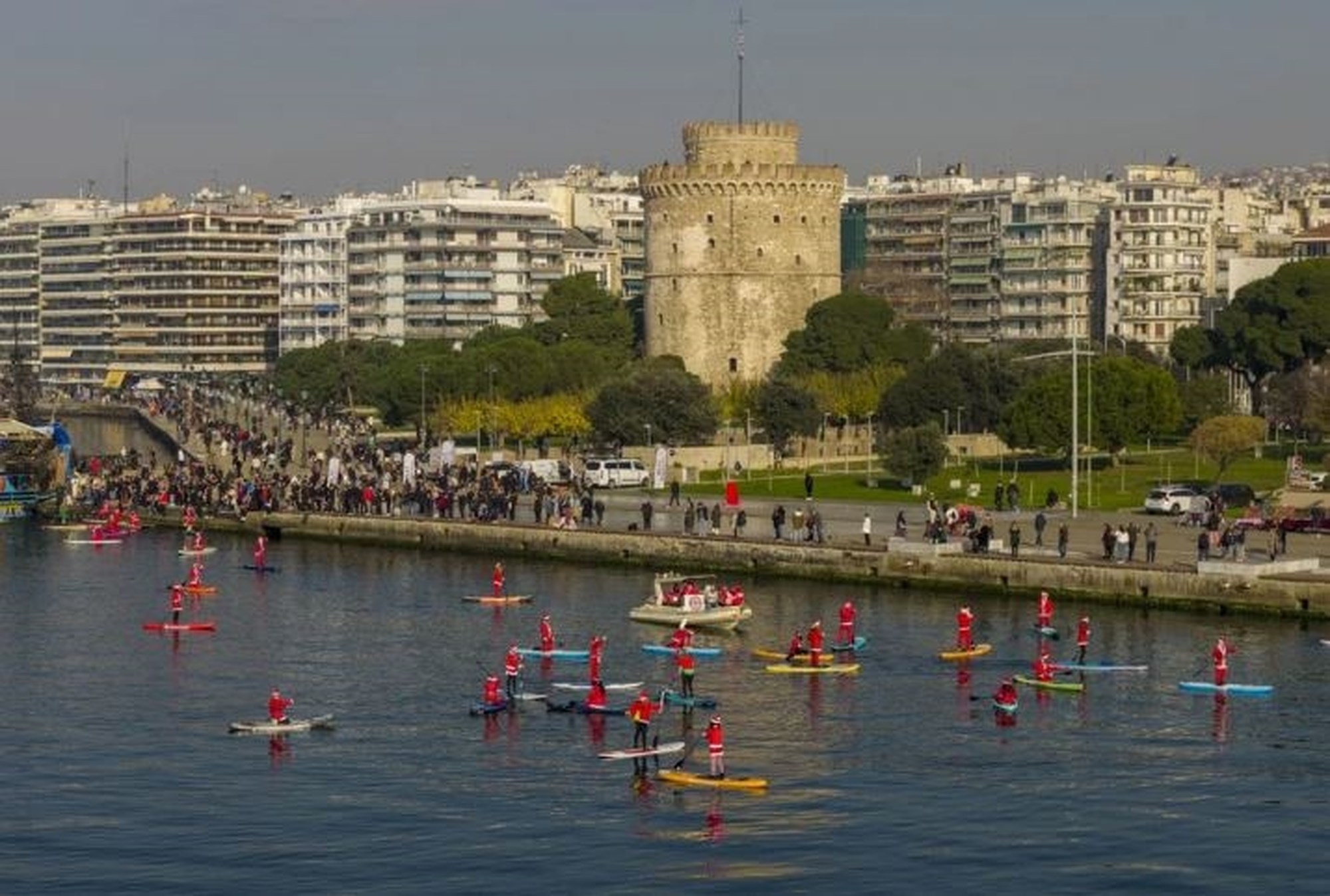 Τα νερά της ακτογραμμής της Θεσσαλονίκης γέμισαν με εικόνες γιορτινές, μεγάλες σανίδες SUP και ήρεμα κουπιά που κρατούσαν Αγιοβασίληδες και Αγιοβασιλίνες σήμερα από το πρωί.