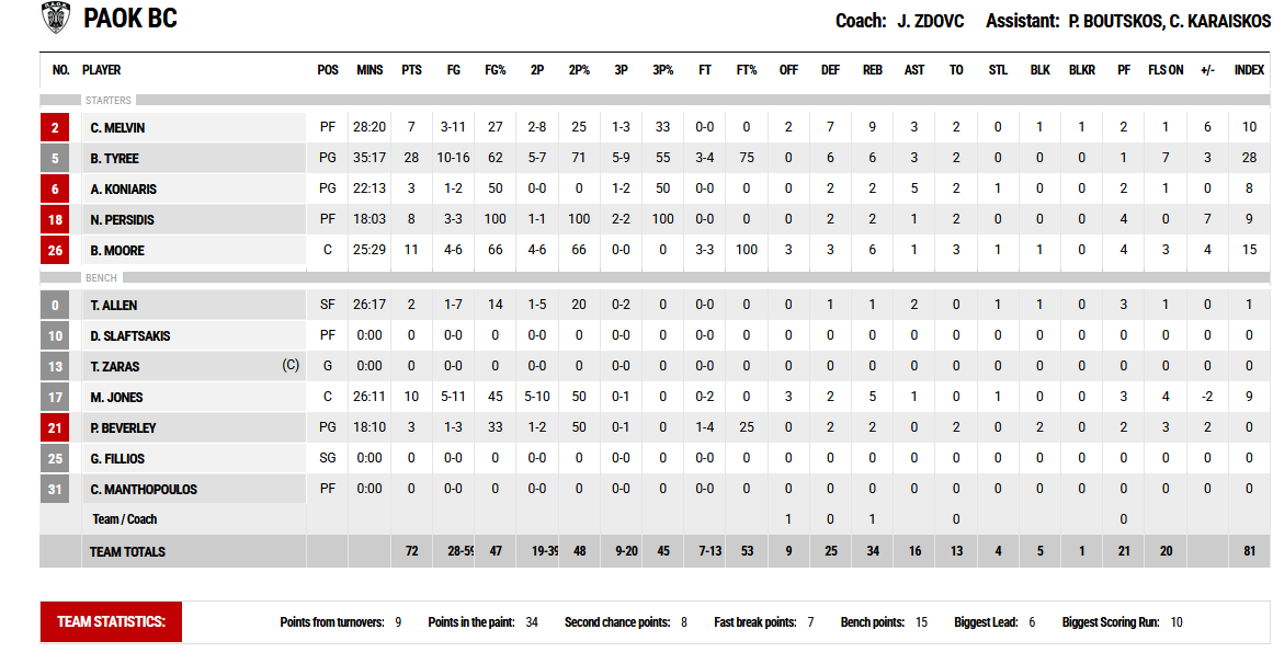 Κορυφαίος για την ομάδα του Γιούρι Ζντοβντς ήταν ο Ταϊρί με 28 πόντους, 6 ριμπάουντ και 3 ασίστ ενώ διψήφιοι ήταν και οι Μουρ, Τζόουνς με 11 και 10 πόντους αντίστοιχα. Για την Καρδίτσα από 16 πόντους είχαν οι Τζέφερσον και Ουάσινγκτον, αλλά δεν ήταν αρκετοί για την ομάδα τους.