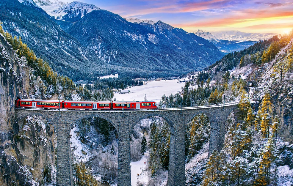 Κατά μήκος της διαδρομής, το τρένο διασχίζει 291 γέφυρες και 91 σήραγγες, με κορυφαία στιγμή το εμβληματικό Landwasser Viaduct.