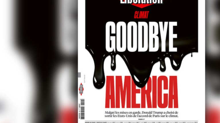«Goodbye America» - «Αντίο Αμερική» είναι ο πρωτοσέλιδος τίτλος της Liberation που επικρίνει την απόφαση του Ντόναλντ Τραμπ να αποσύρει τις ΗΠΑ από τη Συμφωνία των Παρισίων για την κλιματική αλλαγή.
