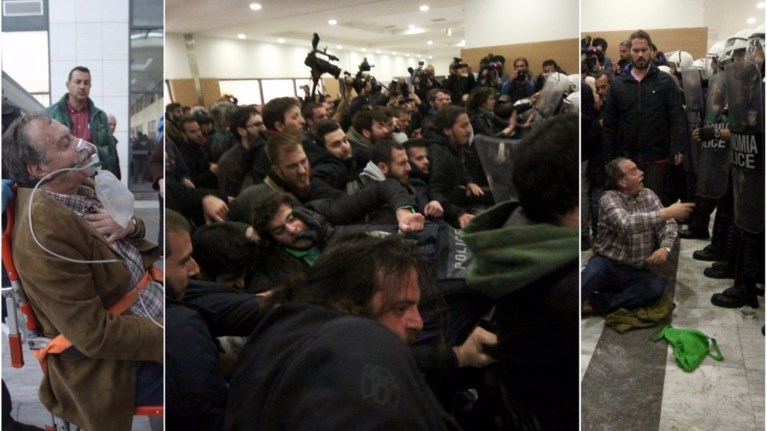Οι πρωτοφανείς εικόνες που βλέπουν το φως της δημοσιότητας δείχνουν μάχες σώμα με σώμα μεταξύ ΜΑΤ και συλλογικοτήτων, ενώ η αστυνομία έκανε χρήση χημικών ακόμη και μέσα στην αίθουσα.