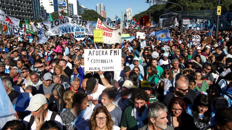 Χιλιάδες πολίτες της Αργεντινής κατέκλυσαν σήμερα τους δρόμους του Μπουένος Άιρες για να διαμαρτυρηθούν για τις προσπάθειες της κυβέρνησης να εξασφαλίσει μια νέα "γραμμή οικονομικής στήριξης" από το Διεθνές Νομισματικό Ταμείο.