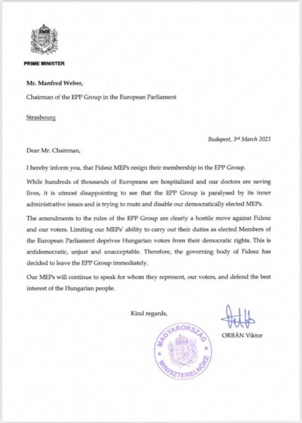 «Οι τροποποιήσεις στους κανόνες της ομάδας του ΕΛΚ είναι ξεκάθαρα μία εχθρική κίνηση εναντίον του Fidesz και των ψηφοφόρων μας», υποστηρίζει στην επιστολή του ο Όρμπαν. «Περιορίζοντας τη δυνατότητα των ευρωβουλευτών μας να εκτελούν τα καθήκοντά τους ως εκλεγμένα μέλη του Ευρωπαϊκού Κοινοβουλίου, στερεί τους Ούγγρους ψηφοφόρους από τα δημοκρατικά τους δικαιώματα. Αυτό είναι αντιδημοκρατικά, άδικο και απαράδεκτο. Γι’ αυτό το Fidesz αποφάσισε να αποχωρήσει από την Κοινοβουλευτική Ομάδα του ΕΛΚ αμέσως».