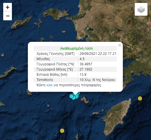 Το επίκεντρο του δεύτερου σεισμού εντοπίστηκε στα 10 χιλιόμετρα νότια της Νισύρου, ενώ το εστιακό βάθος εκτιμήθηκε στα 9,9 χιλιόμετρα, σύμφωνα με το Γεωδυναμικό Ινστιτούτο.