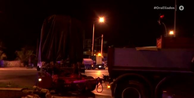 Άνδρες της Αστυνομίας έκλεισαν τον δρόμο και αυτήν την ώρα στο σημείο βρίσκονται συνεργεία που προσπαθούν να μεταφέρουν το φορτηγό με το μεγάλο φορτίο.