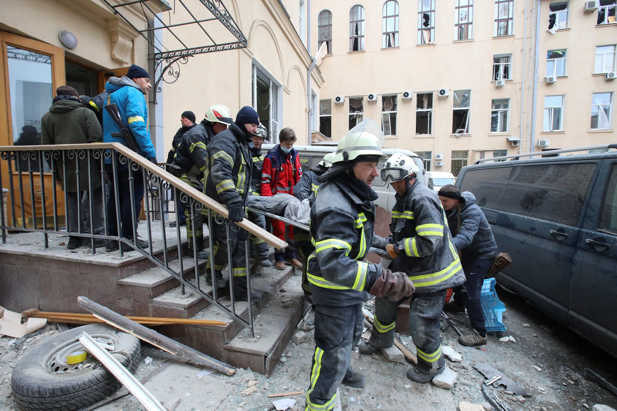 Το πρωί, στον βομβαρδισμό της κεντρικής πλατείας του Χαρκίβ έχασαν τη ζωή τους τουλάχιστον 10 άνθρωποι και άλλοι 20 τραυματίστηκαν. Στις φωτογραφίες που δημοσιοποίησε η υπηρεσία, οι διασώστες ανασύρουν θύματα από τα συντρίμμια της έδρας της τοπικής διοίκησης. Άλλοι 11 άνθρωποι σκοτώθηκαν την Δευτέρα στην ίδια πόλη.