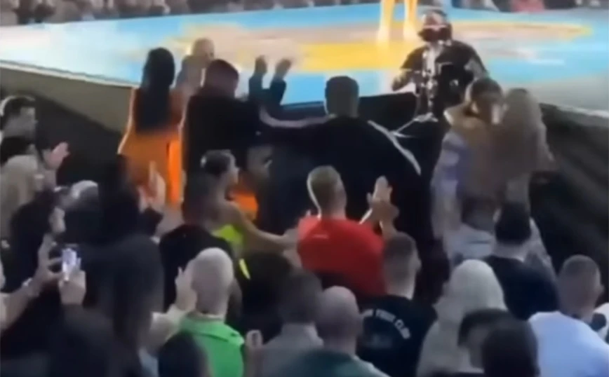 Η κατάσταση ξέφυγε με καρέκλες να εκσφενδονίζονται και να κρίνεται απαραίτητη η επέμβαση τρίτων. Κοντά στο σημείο της συμπλοκής βρισκόταν και η Έλενα Παπαρίζου με την τρομοκρατημένη τραγουδίστρια να φυγαδεύεται από τους διοργανωτές.