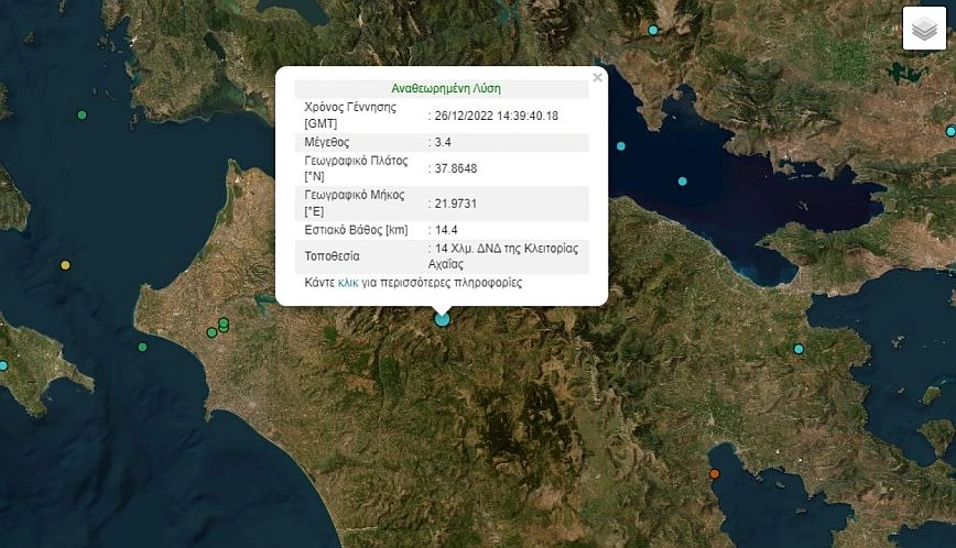 Ο σεισμός σημειώθηκε περίπου στις 16:40 σήμερα (26.12.2022) και το επίκεντρό του εντοπίζεται 14 χιλιόμετρα δυτικά, νοτιοδυτικά της Κλειτορίας, στην περιοχή των Καλαβρύτων, σύμφωνα με το Γεωδυναμικό Ινστιτούτο του Εθνικού Αστεροσκοπείου Αθηνών.