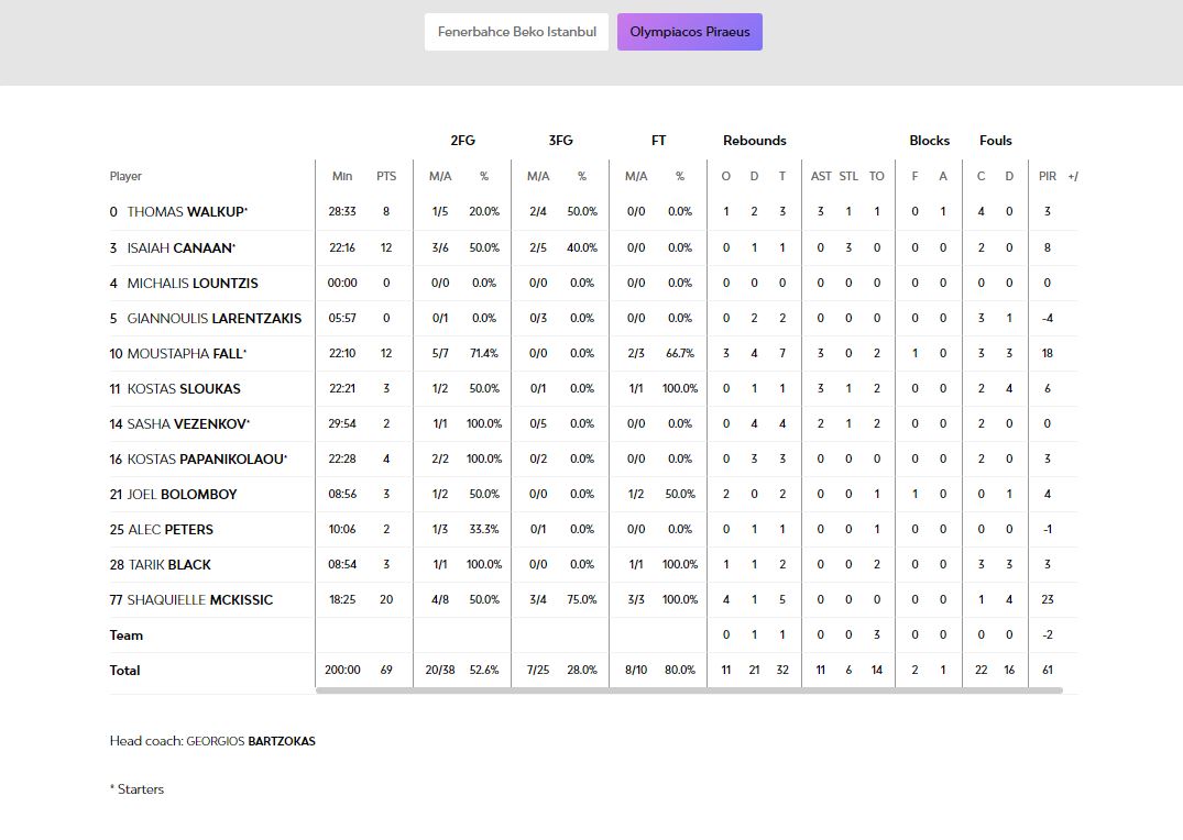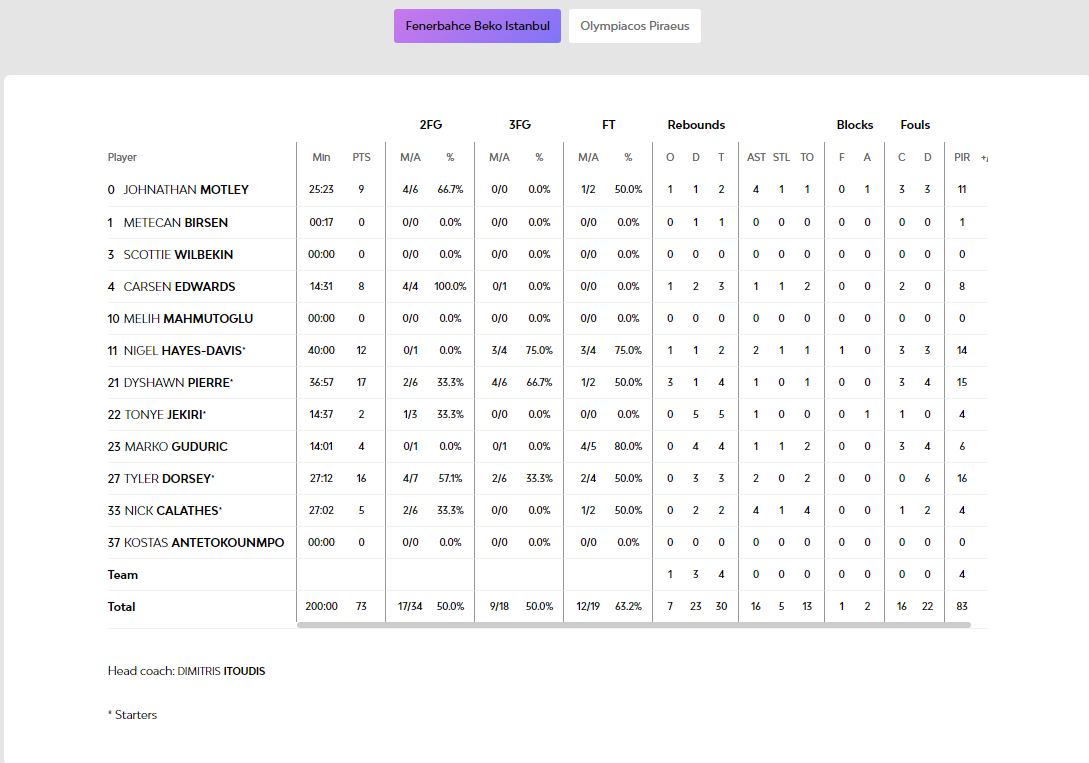 Ο Πιερ σκότωσε τους Πειραιώτες καθώς στα τελευταία λεπτά έβαλε όλα τα κρίσιμα σουτ, ενώ από τους κορυφαίους για τη Φενέρ ήταν ο Χέιζ-Ντέιβις που αγωνίστηκε για 40 λεπτά (!) και σκόραρε 12 πόντους.