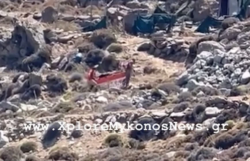 Άνδρες της πυροσβεστικής υπηρεσίας Μυκόνου παρέλαβαν το άψυχο σώμα στο οποίο θα γίνει νεκροψία – νεκροτομή για να εξακριβωθούν οι συνθήκες και τα αίτια θανάτου του άτυχου άνδρα.