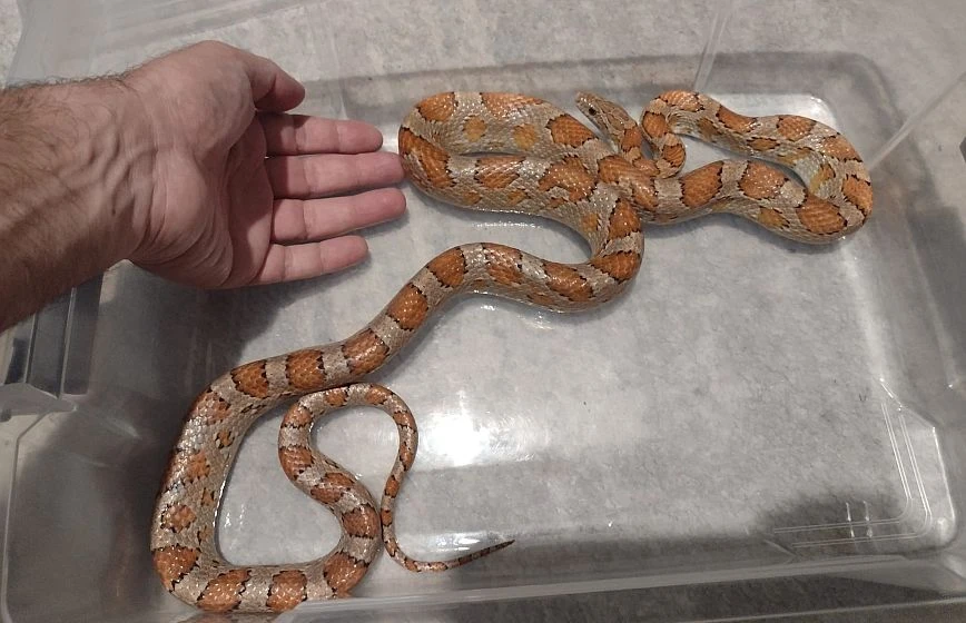 Πρόκειται για Corn Snake, είδος πολύ συνηθισμένο στο εμπόριο κατοικίδιων ζώων και πιθανότατα ξέφυγε από γυάλα κοντινού σπιτιού.