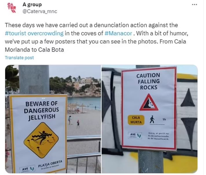 Σύμφωνα με τη Sun, η πινακίδα που προειδοποιεί στα Αγγλικά, ότι υπάρχουν τσούχτρες στο νερό, στα καταλανικά γράφει «Ανοιχτή παραλία. Όχι στις μέδουσες όχι και στους ξένους». Και η πινακίδα που γράφει ότι πέφτουν βράχια, στα καταλανικά γράφει ότι δεν πέφτουν βράχια, και ότι ο κίνδυνος δεν είναι οι «κατολισθήσεις, αλλά ο «υπερπληθυσμός». Οι πινακίδες τοποθετήθηκαν από την αντικαπιταλιστική ακτιβιστική ομάδα Caterva – η οποία επέκρινε τον αστέρα του τένις Ραφαέλ Ναδάλ επειδή έχει ένα εστιατόριο και μια τουριστική επιχείρηση στο νησί των Βαλεαρίδων, όπως και άλλους επιχειρηματίες στην περιοχή.