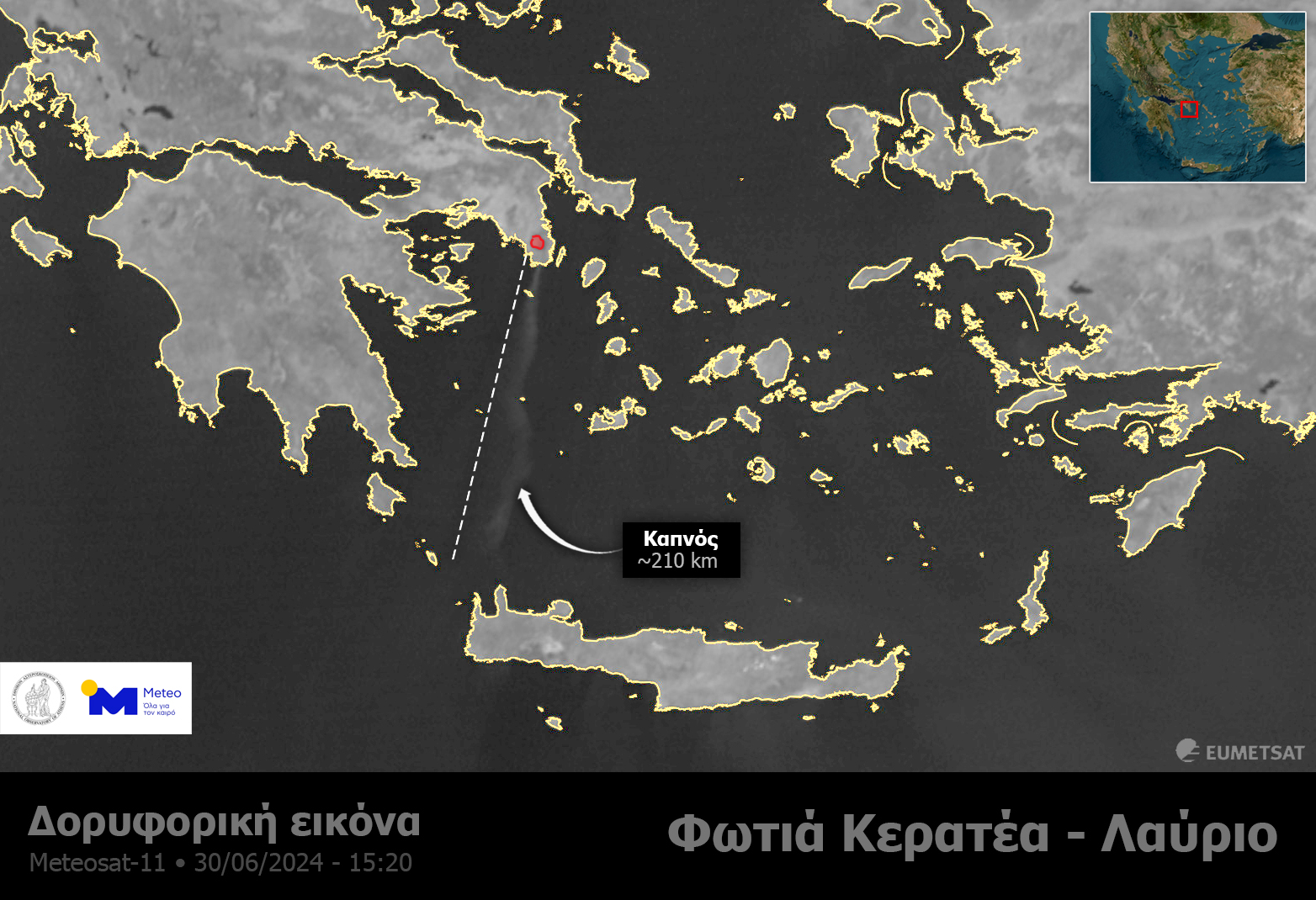 «Στη δορυφορική φωτογραφία, λίγο μετά τις 3 το μεσημέρι της Κυριακής 30/06 ,διακρίνουμε τον καπνό από τη φωτιά στην περιοχή της Κερατέας. Ο καπνός έχει φτάσει σε λίγες ώρες στη θαλάσσια περιοχή βορειοδυτικά της Κρήτης, καλύπτοντας, προσεγγιστικά, απόσταση 210 km».