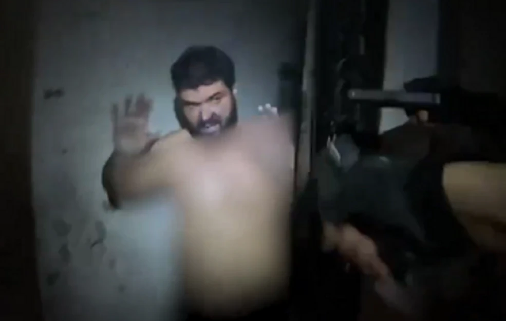 Στα πλάνα διακρίνεται να εμφανίζεται με τα χέρια στον αέρα και φορώντας μόνο εσώρουχα, με τους στρατιώτες να ζητούν να γονατίσει, ώστε να τον συλλάβουν.