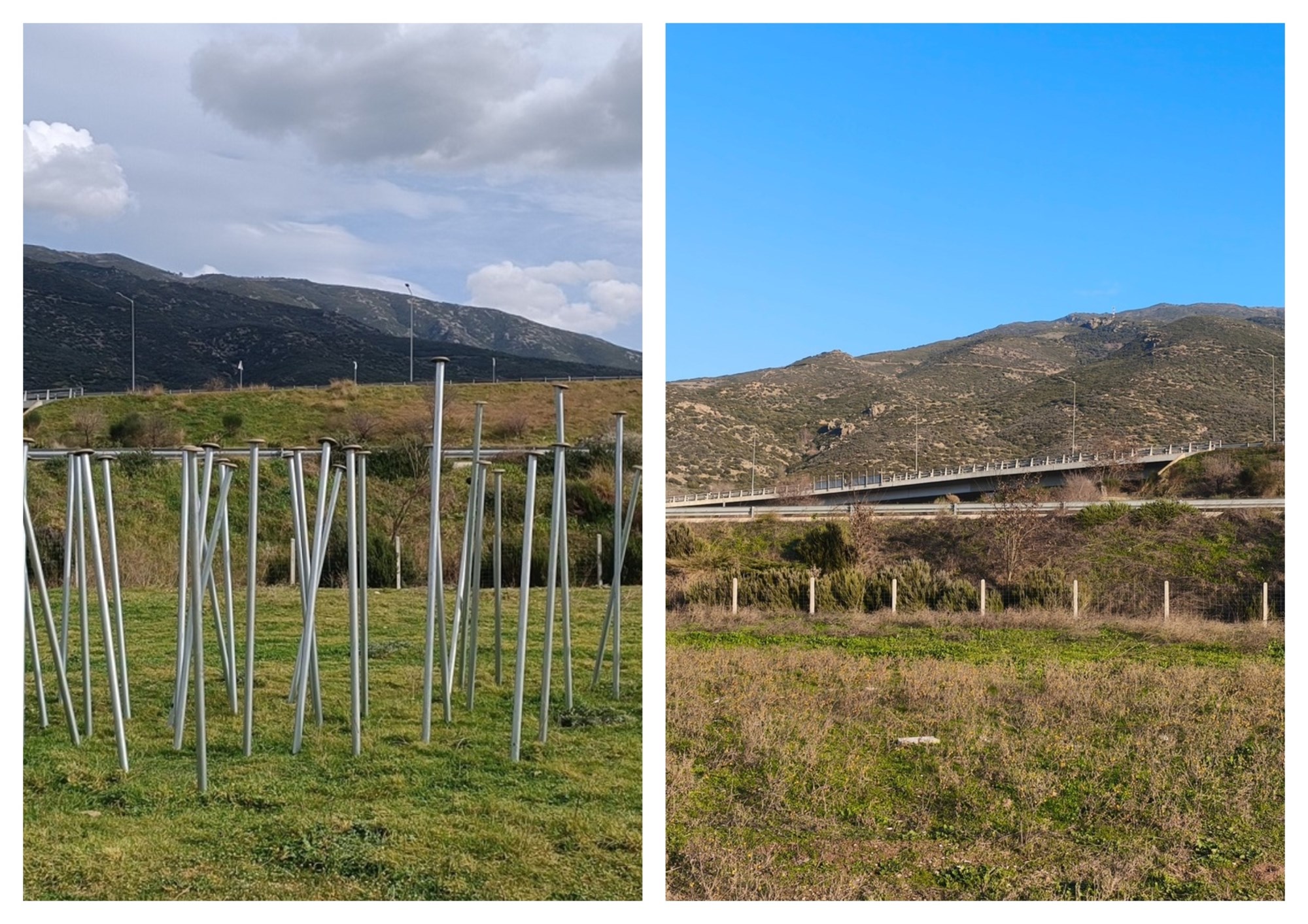 Το έργο "58 καρφιά στα Τέμπη" αποτελούνταν από 58 μεταλλικούς σωλήνες ύψους 2-2,5 μέτρων.