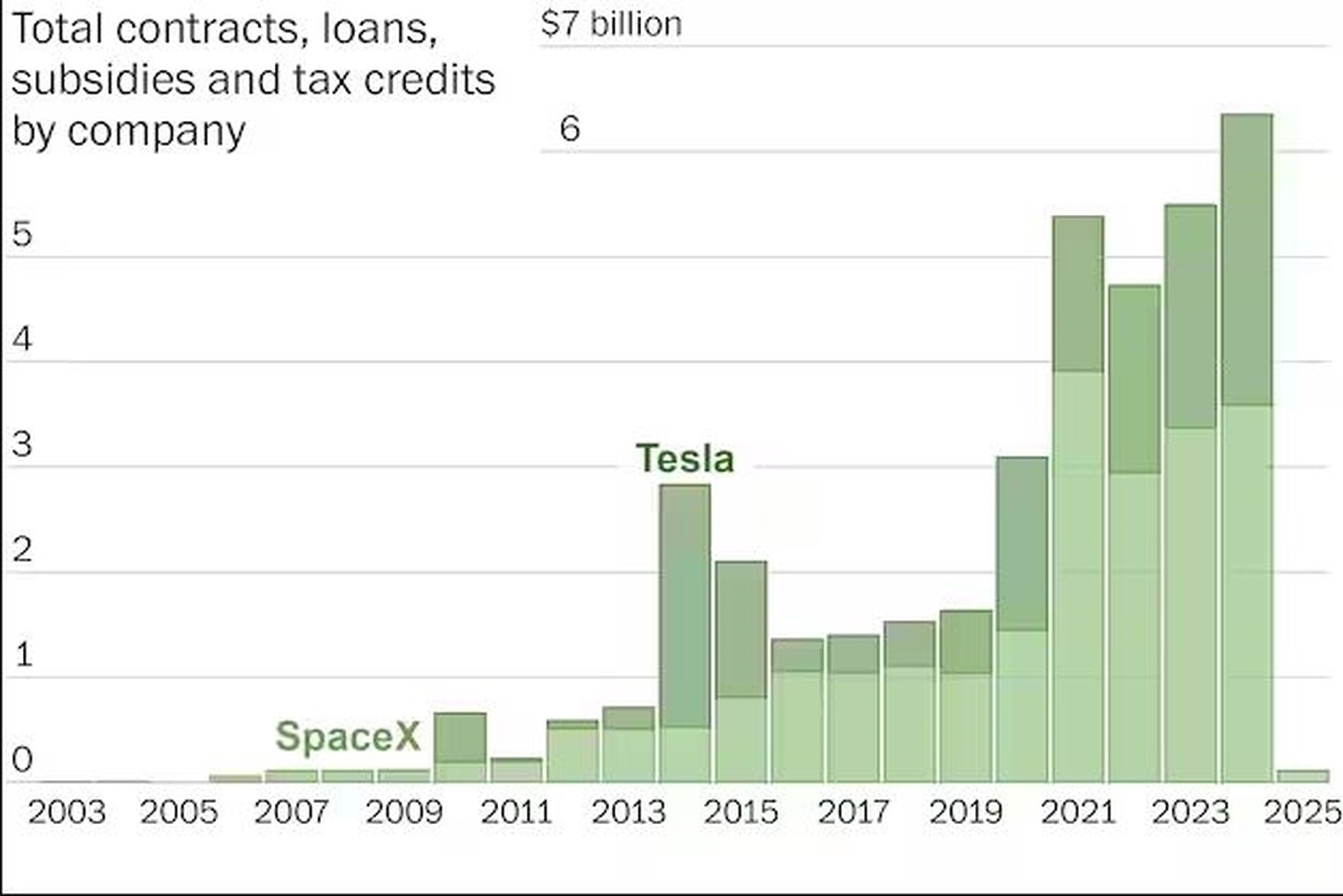Σύμφωνα με το δημοσίευμα της Washington Post, ο Ίλον Μασκ έχει πάρει τουλάχιστον 38 δισεκατομμύρια δολάρια μέσω κυβερνητικών συμβολαίων, επιδοτήσεων και δανείων, γεγονός που τον βοήθησε να γίνει ο πλουσιότερος άνθρωπος του κόσμου.