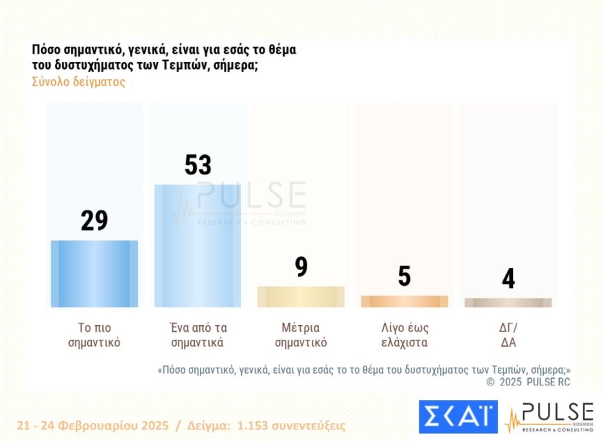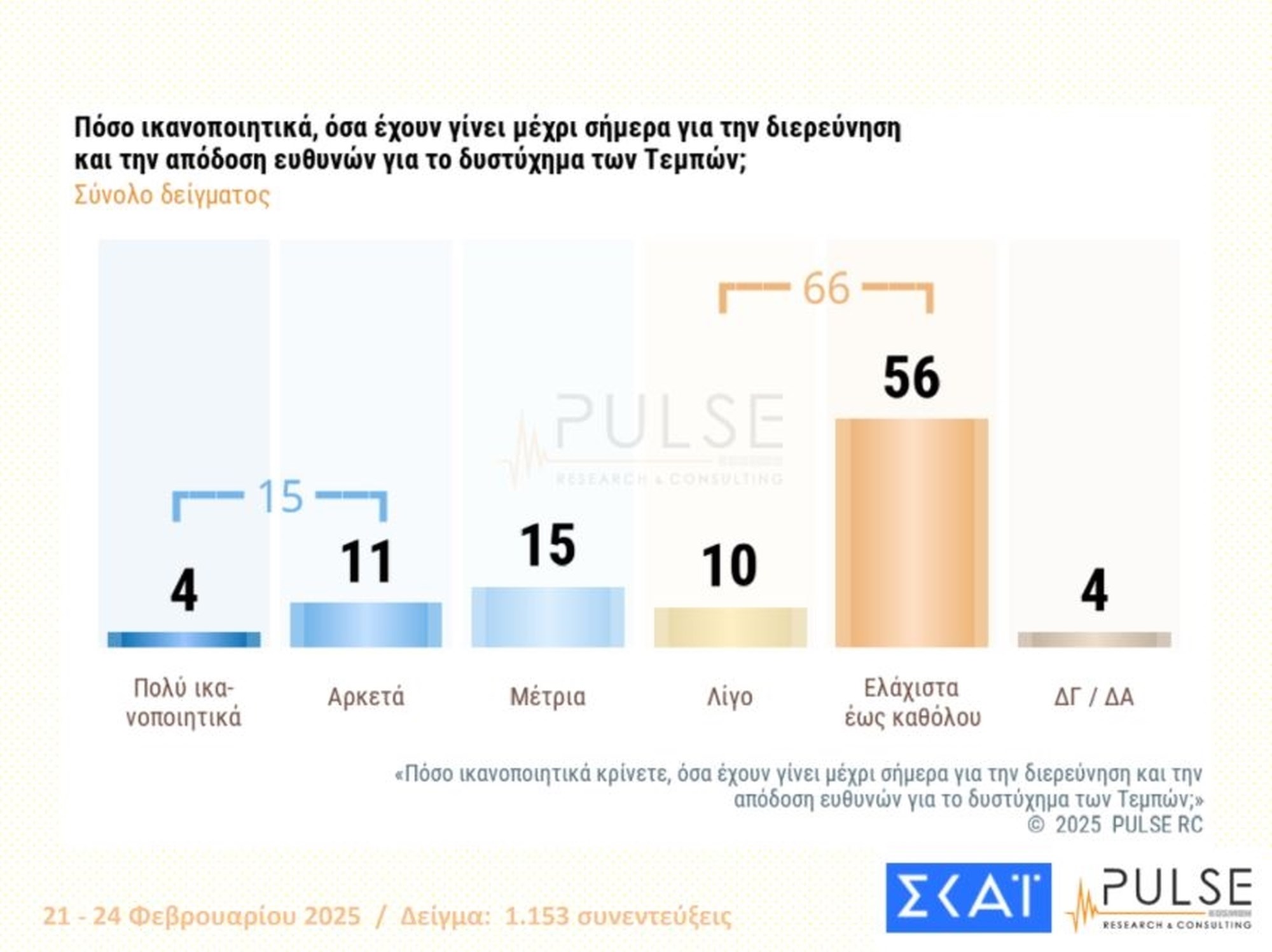Δυσαρεστημένο με τις ενέργειες της κυβέρνησης στην υπόθεση των Τεμπών δηλώνει ένα μεγάλο ποσοστό των πολιτών (66%) στη νέα δημοσκόπηση της εταιρείας Pulse, για λογαριασμό του ΣΚΑΪ. Η ίδια έρευνα αποτυπώνει τον κατακερματισμό της πολιτικής σκηνής στην Ελλάδα, καθώς, σύμφωνα με τα αποτελέσματα της δημοσκόπησης, το ποσοστό εισόδου στη Βουλή καλύπτεται από εννέα κόμματα, ενώ στο όριο βρίσκεται και δέκατο.
