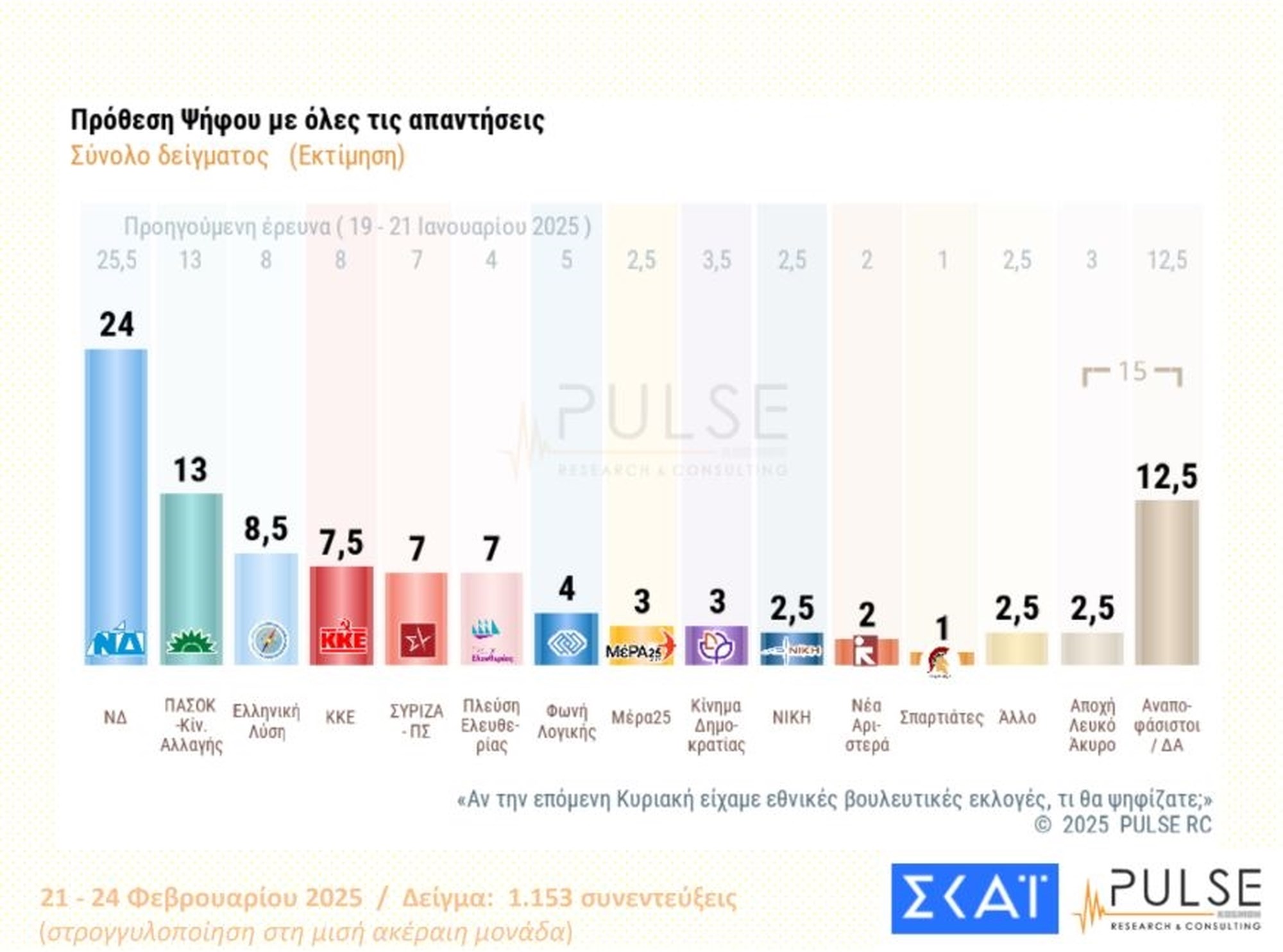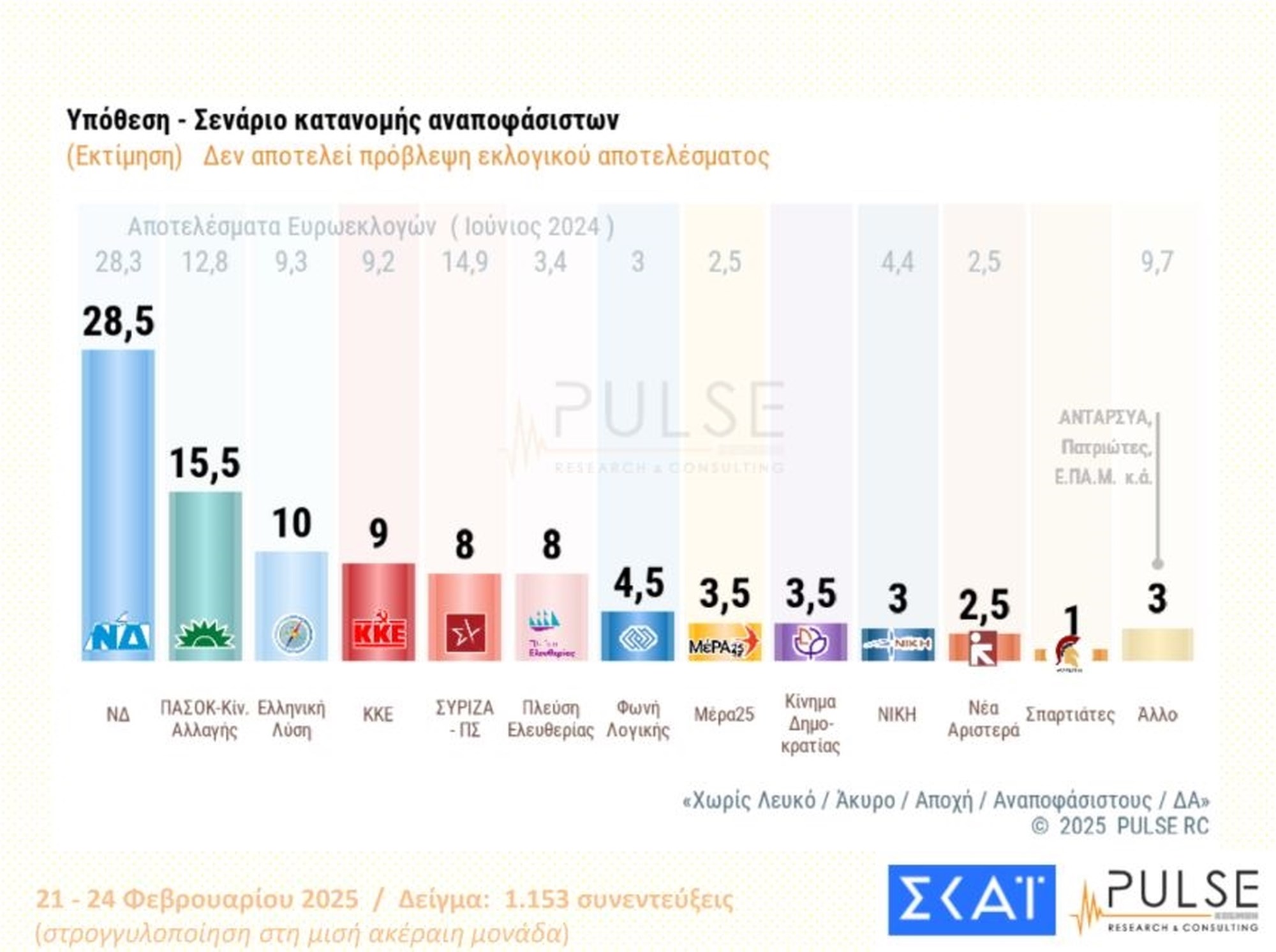 Σύμφωνα με την έρευνα της Pulse, το ποσοστό του 3% που απαιτείται για την είσοδο στη Βουλή, ξεπερνούν εννέα κόμμα, ενώ ένα ακόμα είναι στο όριο.