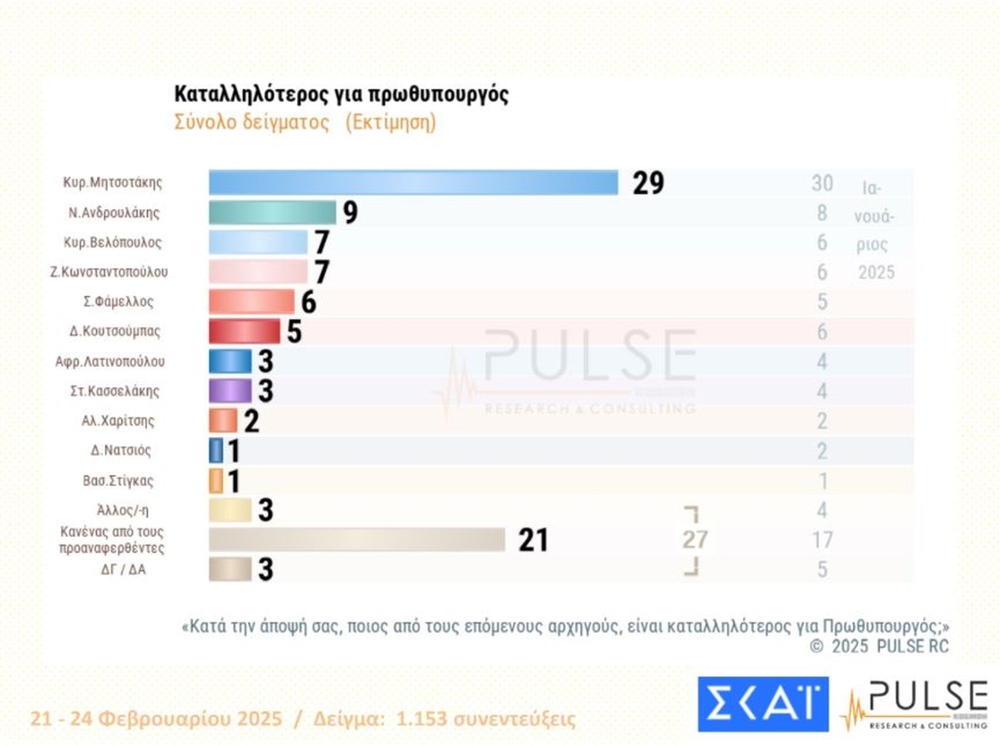 Ο Κυριάκος Μητσοτάκης είναι πρώτος στην καταλληλότητα για την πρωθυπουργία με ποσοστό 29%, μακράν των υπολοίπων. Δεύτερος ο "κανένας" με 21%, ενώ στο 9% καταγράφεται ο πρόεδρος του ΠΑΣΟΚ, Νίκος Ανδρουλάκης.