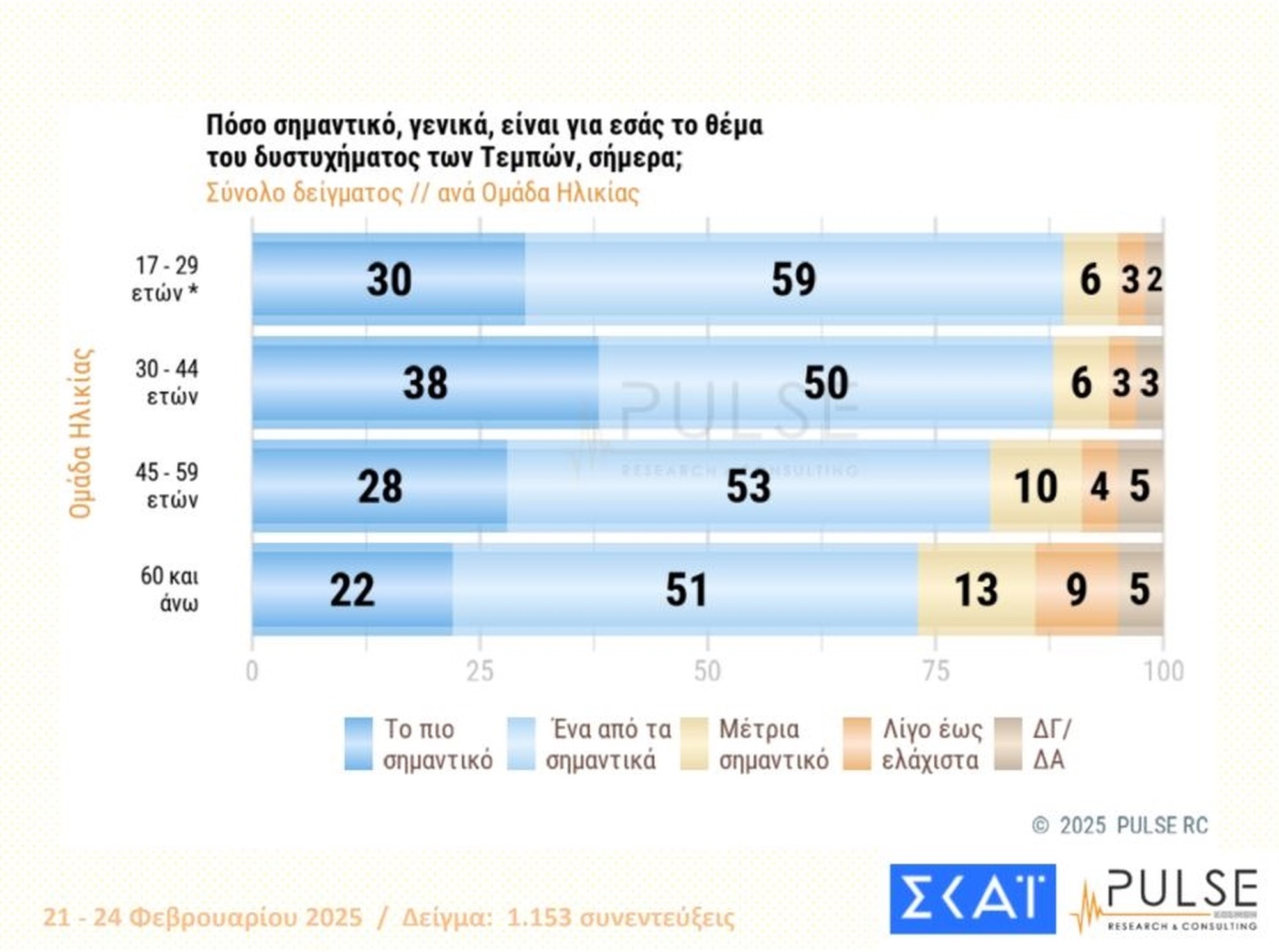 Το κεντρικό ερώτημα, αφορά την υπόθεση των Τεμπών και τους χειρισμούς της κυβέρνησης. Σύμφωνα με τα ευρήματα της έρευνας, το 82% των ερωτηθέντων απάντησε ότι το θέμα των Τεμπών είναι είτε το πιο σημαντικό, είτε ένα από τα πιο σημαντικά θέματα. Μόλις το 14% απάντησε ότι δεν είναι τόσο ή δεν είναι σημαντικό.
