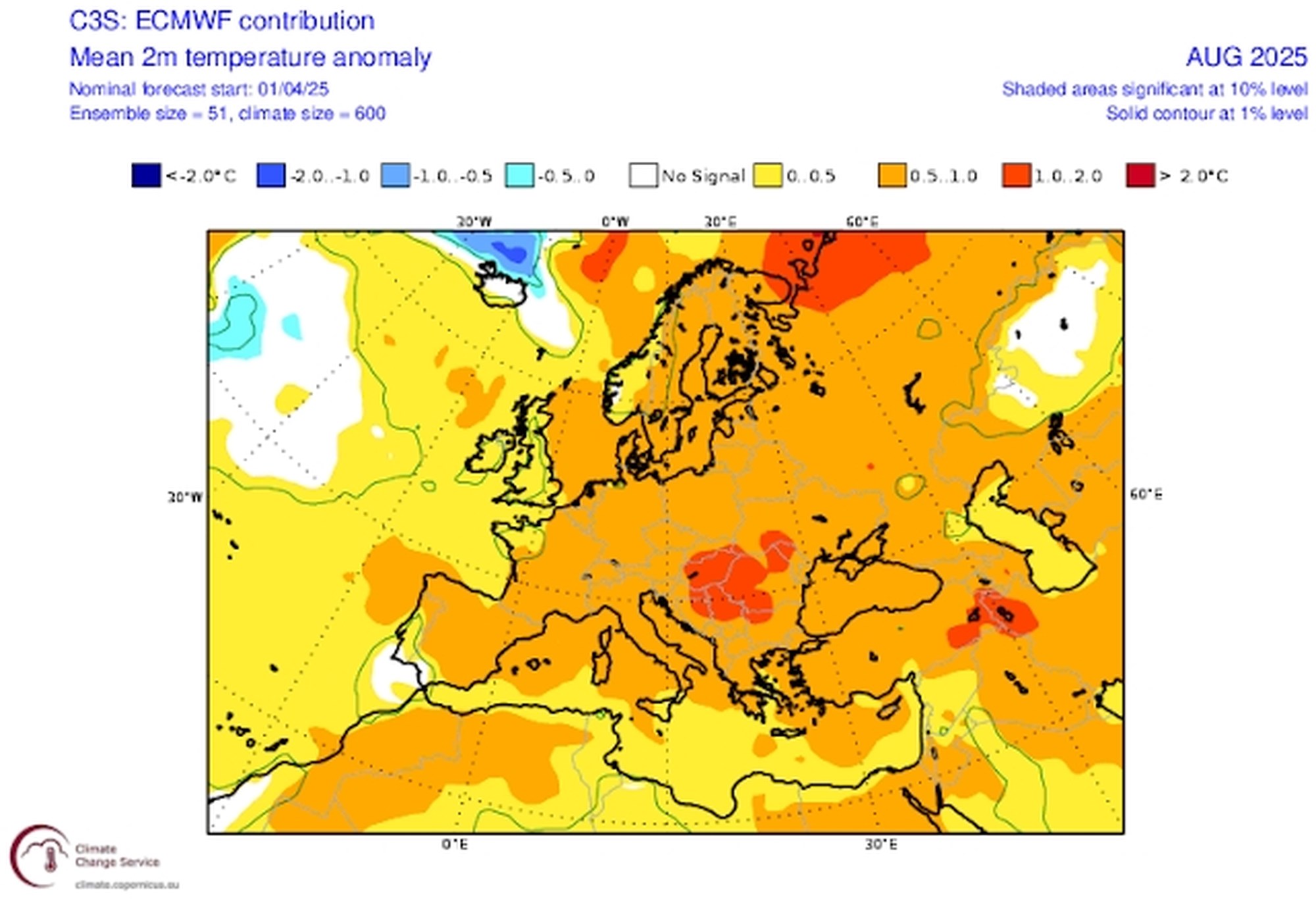 Αν εξετάσουμε την εκτίμηση για τις θερμοκρασίες Αυγούστου μέσα από ECMWF, παρατηρούμε ότι οι τιμές είναι θερμότερες από το κανονικό στο μεγαλύτερο μέρος της ηπείρου. Οι πιο έντονες θερμοκρασιακές ανωμαλίες προβλέπονται στην κεντρική και κεντρονότια Ευρώπη.