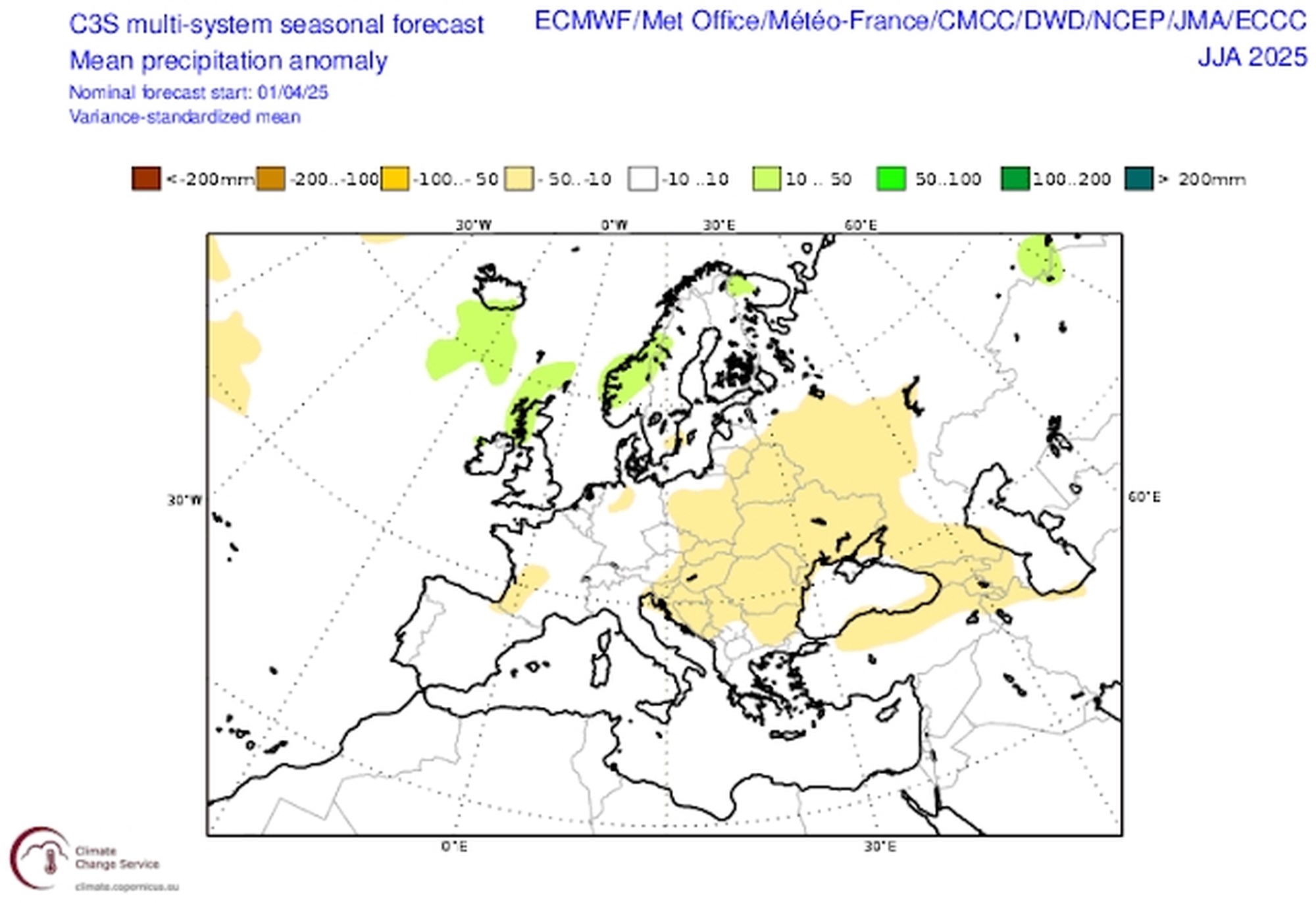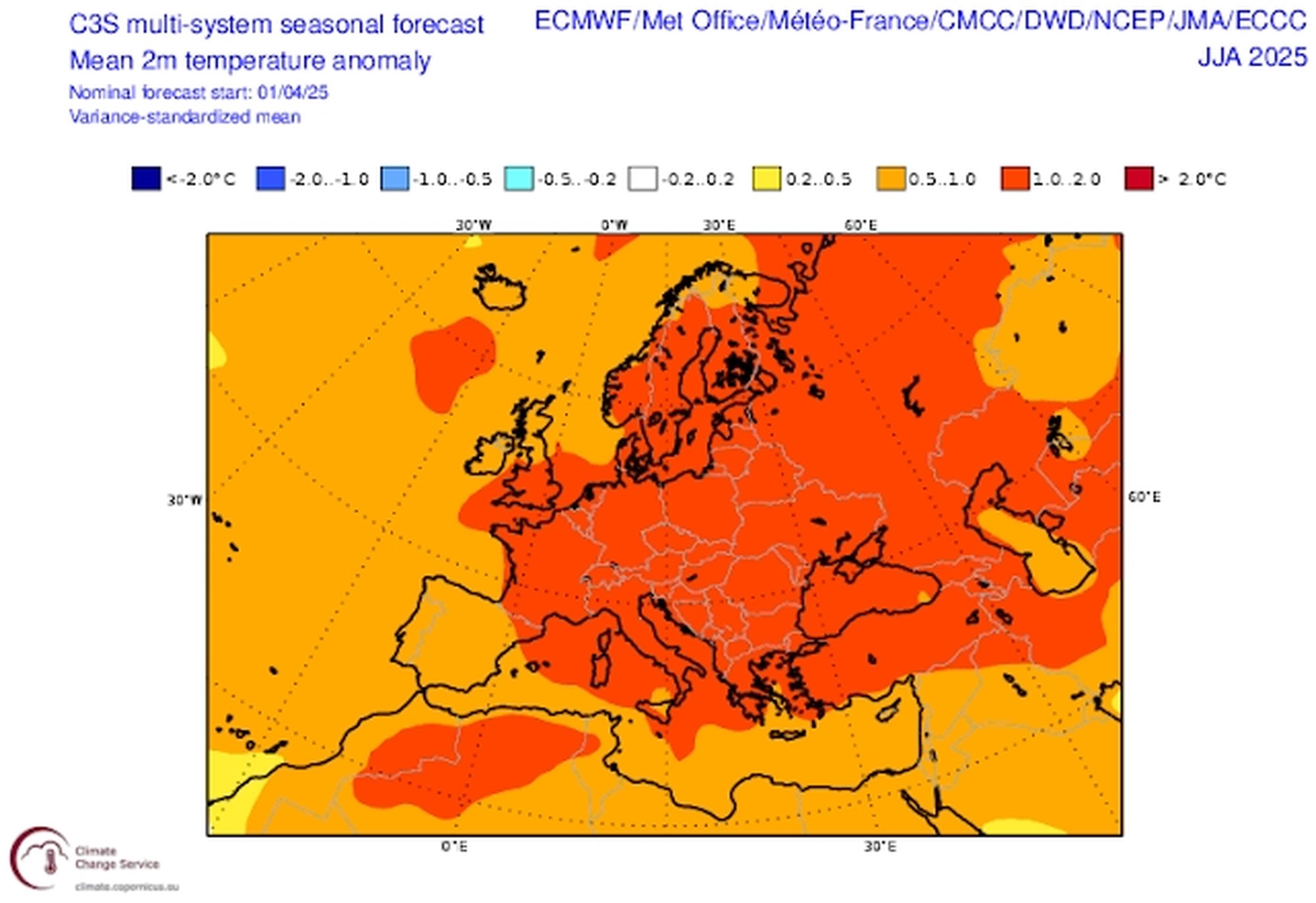 Μια παρόμοια συνολική εικόνα για το καλοκαίρι μας δίνει και το C3S multi-system seasonal forecast, το οποίο βασίζεται σε δεδομένα από διάφορα προηγμένα συστήματα εποχικών προγνώσεων. Τα κέντρα που παρέχουν σήμερα προβλέψεις στο C3S είναι: το ECMWF, το Met Office, η Météo-France, η Γερμανική Μετεωρολογική Υπηρεσία (DWD), το Ευρω-Μεσογειακό Κέντρο για την Κλιματική Αλλαγή (CMCC), η Εθνική Μετεωρολογική Υπηρεσία των ΗΠΑ (NCEP), η Ιαπωνική Μετεωρολογική Υπηρεσία (JMA) και ο Οργανισμός Περιβάλλοντος και Κλιματικής Αλλαγής του Καναδά (ECCC).