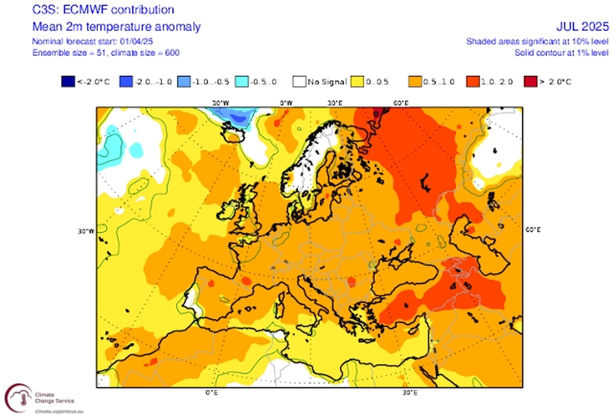 Η εκτίμηση του ECMWF για το θερμοκρασιακό μοτίβο τον Ιούλιο του 2025 δείχνει θετικές αποκλίσεις από τον μέσο όρο για το μεγαλύτερο μέρος της Ευρώπης. Στη χώρα μας, οι αποκλίσεις αυτές κυμαίνονται για ακόμα ένα μήνα από +0,5°C έως και 1,0°C.