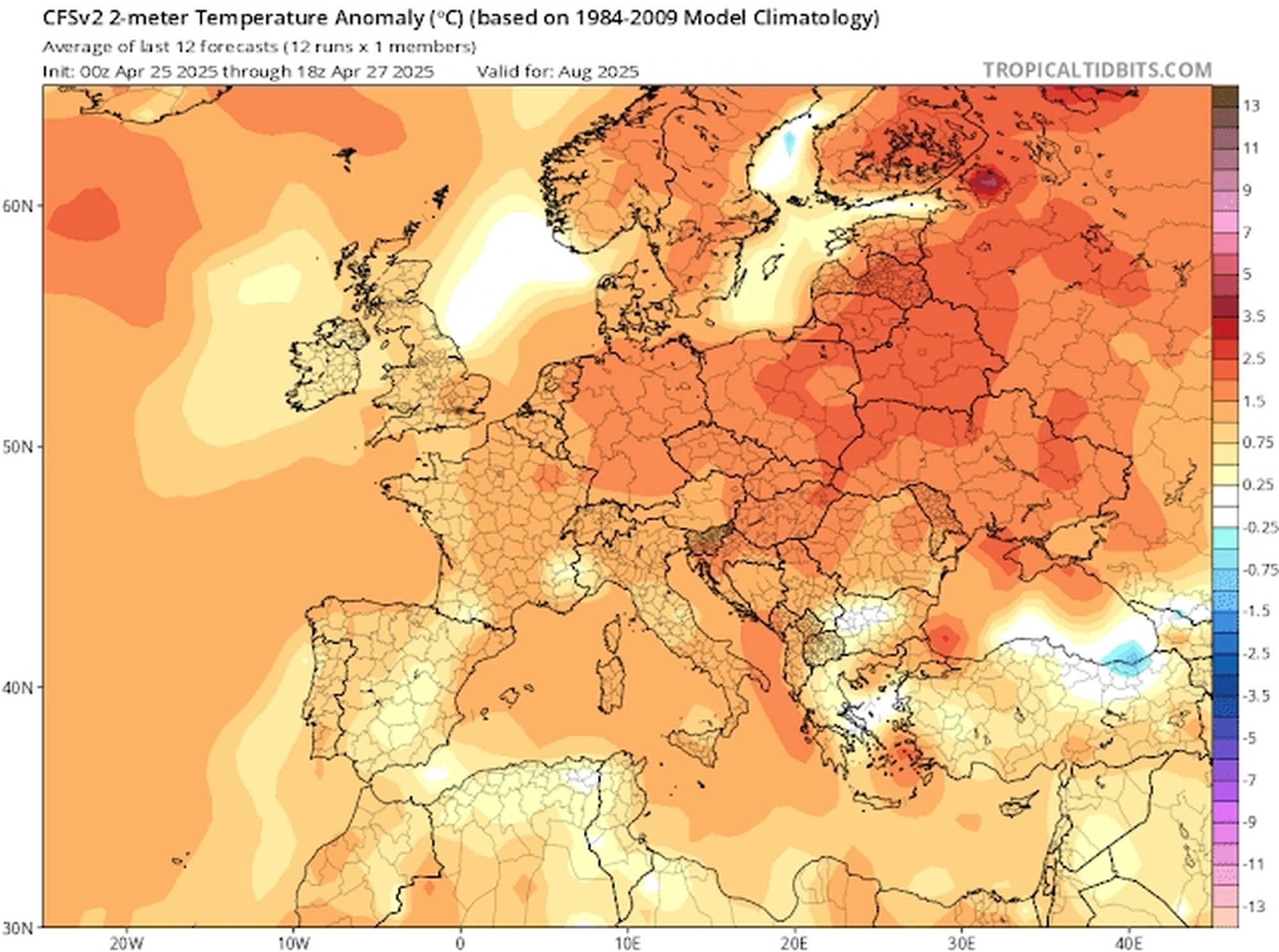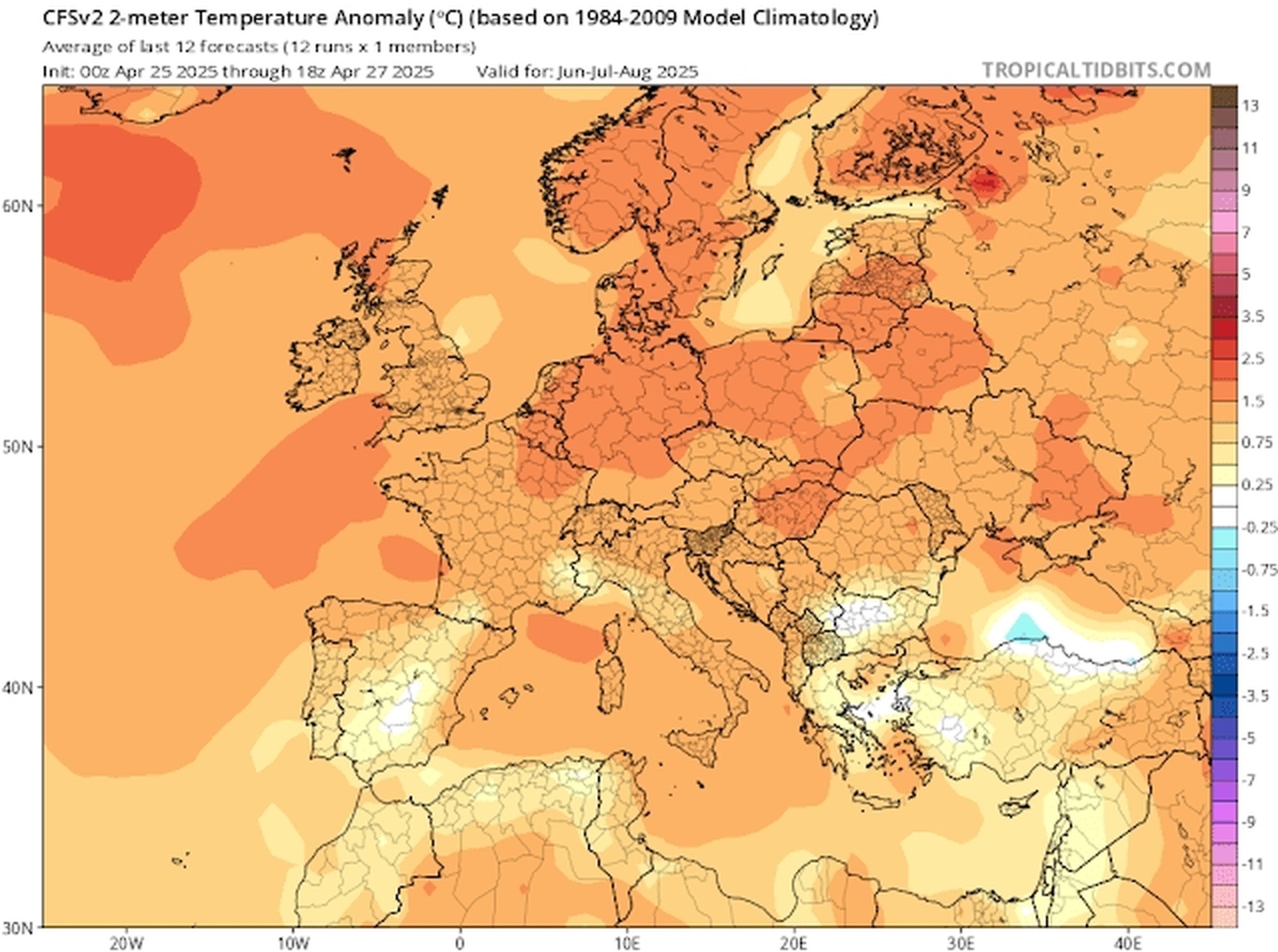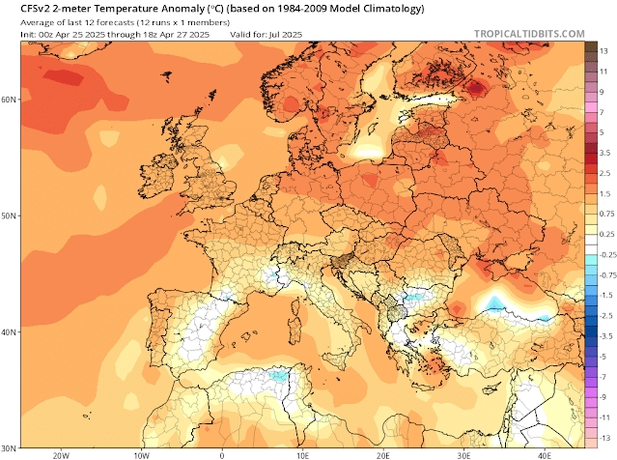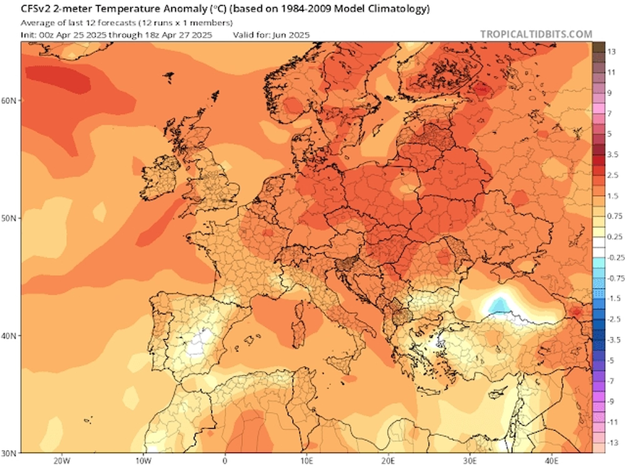 Στην εκτίμηση του CFSv2, οι θερμοκρασιακές αποκλίσεις δείχνουν θετικές για το μεγαλύτερο μέρος της Ευρώπης, ενώ στη χώρα μας είναι ιδιαίτερα αισιόδοξες, με +0,25°C έως και +1,0°C (σε πολύ τοπικό επίπεδο) πάνω από τον μέσο όρο. Πιο θερμός φαίνεται πως θα είναι ο μήνας για τη βόρεια και βορειοανατολική Ευρώπη.