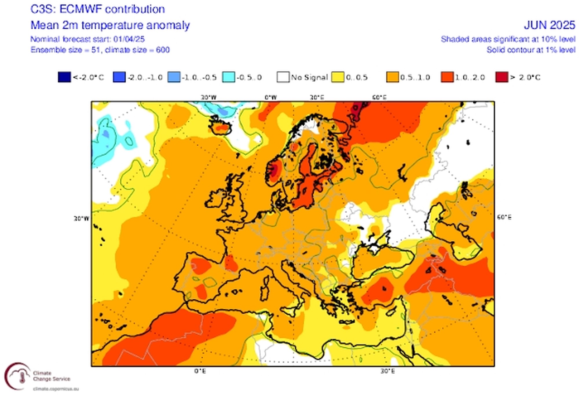 Ξεκινώντας με τον Ιούνιο και τις θερμοκρασιακές του αποκλίσεις, η πρόγνωση του ECMWF δείχνει θερμότερες συνθήκες για το μεγαλύτερο μέρος της Ευρώπης. Πιο θερμός προβλέπεται ο Ιούνιος για την δυτικά και βόρεια Ευρώπη.