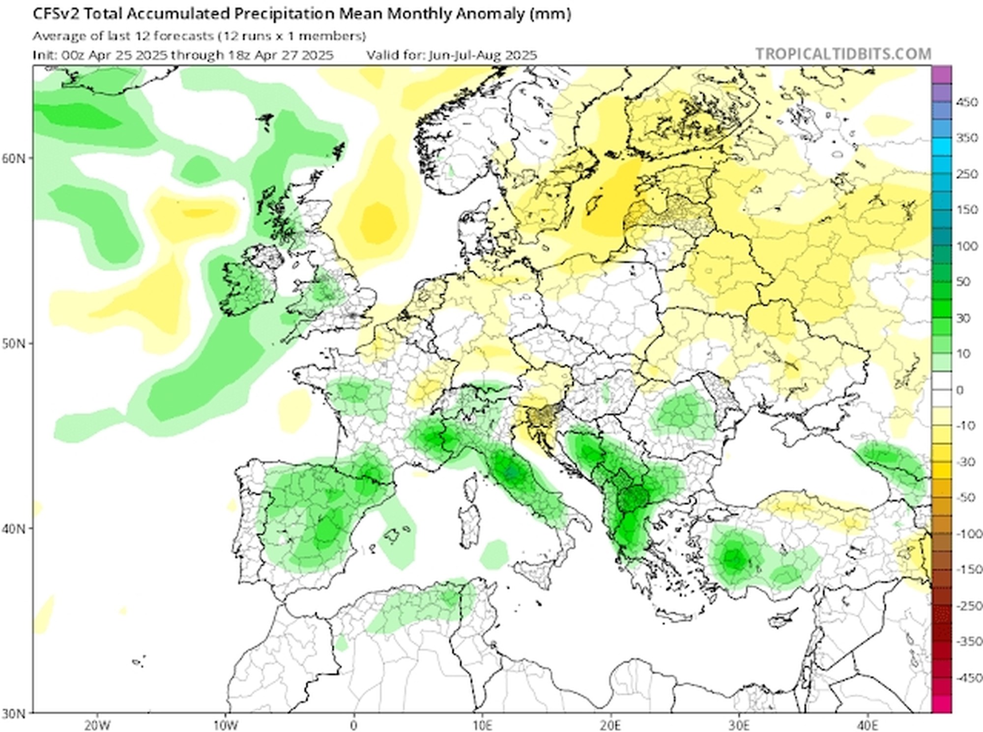 Στην πρόγνωση για τις βροχοπτώσεις του Ιουλίου, βλέπουμε κυρίως πιο ξηρές συνθήκες για την νότια και δυτική Ευρώπη. Στη χώρα μας προβλέπεται ένας πιο ξηρός μήνας έως και κατά -25mm από τον μέσο όρο για τον μήνα.