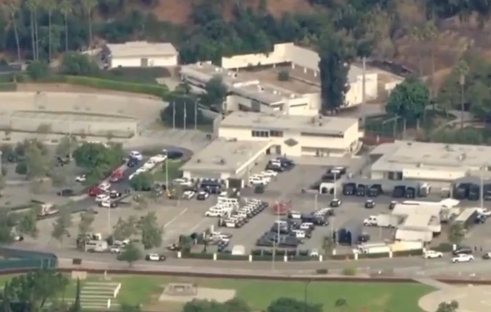 Στα πλάνα από ελικόπτερο που μετέδωσε το τοπικό τηλεοπτικό κανάλι KTLA φαίνεται ένας άνθρωπος που φορά την ειδική στολή των πυροτεχνουργών να κινείται κοντά σε ένα φορτηγό που ενδέχεται να περιέχει εκρηκτικά και οι δυνάμεις ασφαλείας το έχουν καλύψει με μια μεγάλη τέντα.