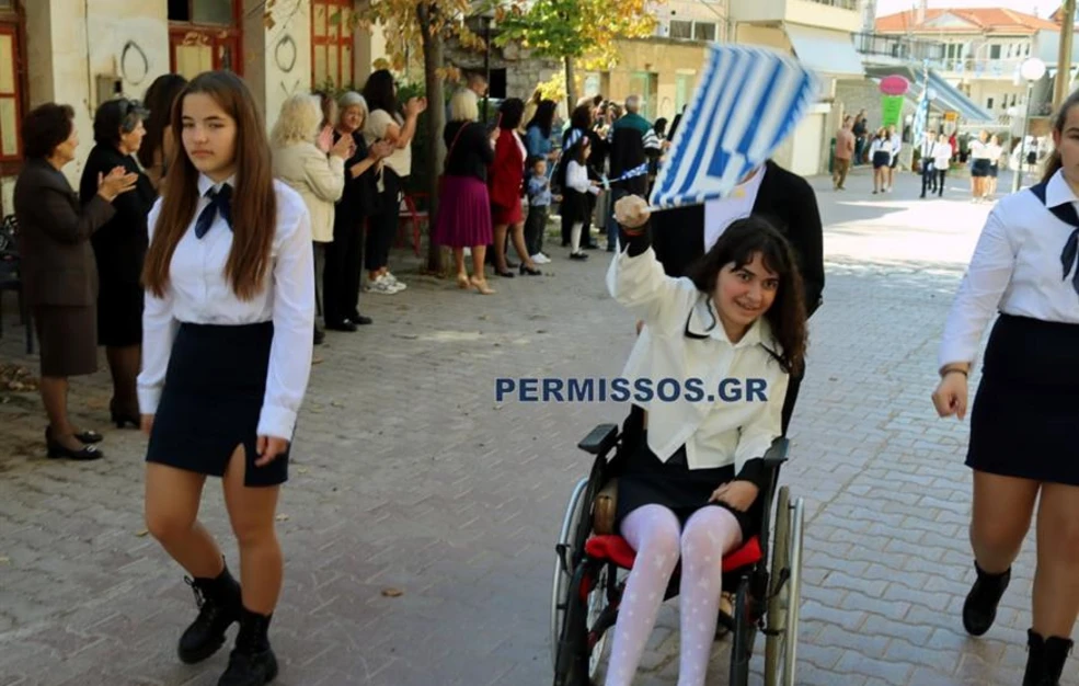 Στις φωτογραφίες που δημοσιεύει το permissos.gr, η μικρή μαθήτρια της πρώτης Γυμνασίου κρατά την ελληνική σημαία και συμμετέχει στην παρέλαση στους κεντρικούς δρόμους της γενέτειράς της, αφήνοντας ένα δυνατό μήνυμα δύναμης και ελπίδας.