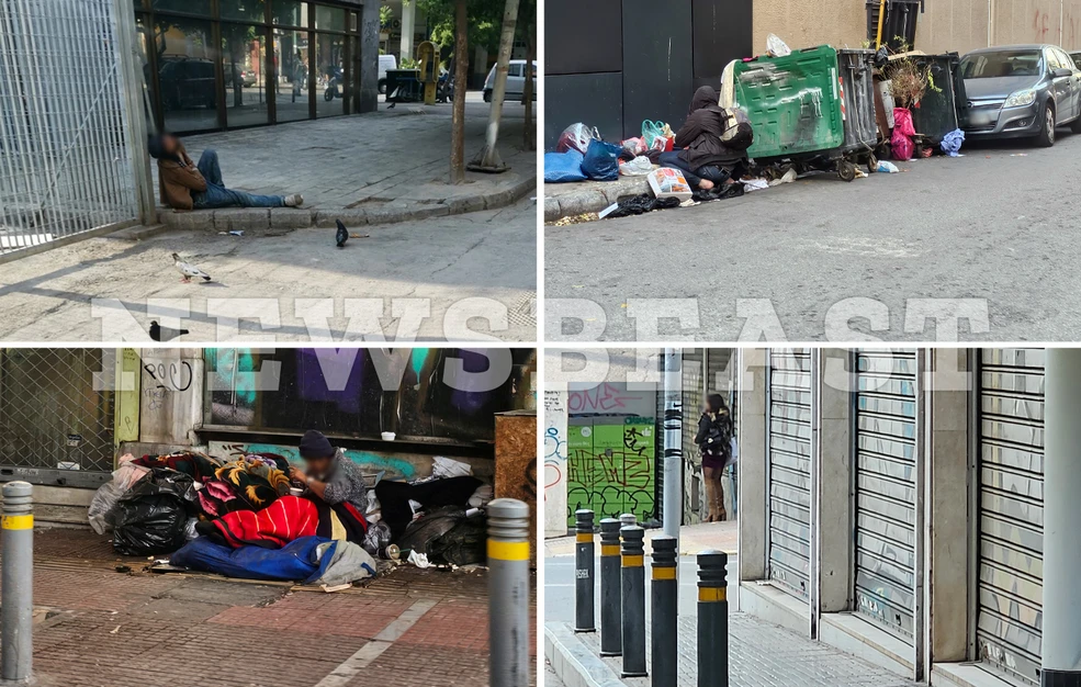 Μέσα στο τσουχτερό κρύο κάποιοι παρακαλούσαν για λίγα ψιλά, μήπως και εξασφαλίσουν τη δόση τους ή μια μπουκιά φαγητό. Ένα σουρεαλιστικό σκηνικό δίπλα από τα νέα ξενοδοχεία που κοσμούν εδώ και λίγα χρόνια το κέντρο της Αθήνας.