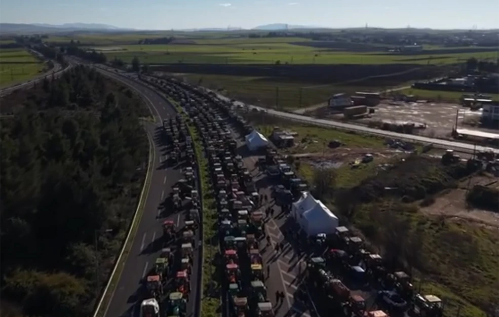 Εικόνα από drone δείχνει τον δρόμο να έχει «πλημμυρίσει» από τρακτέρ, τα οποία υπολογίζεται ότι να μείνουν για περίπου τρεις ώρες.