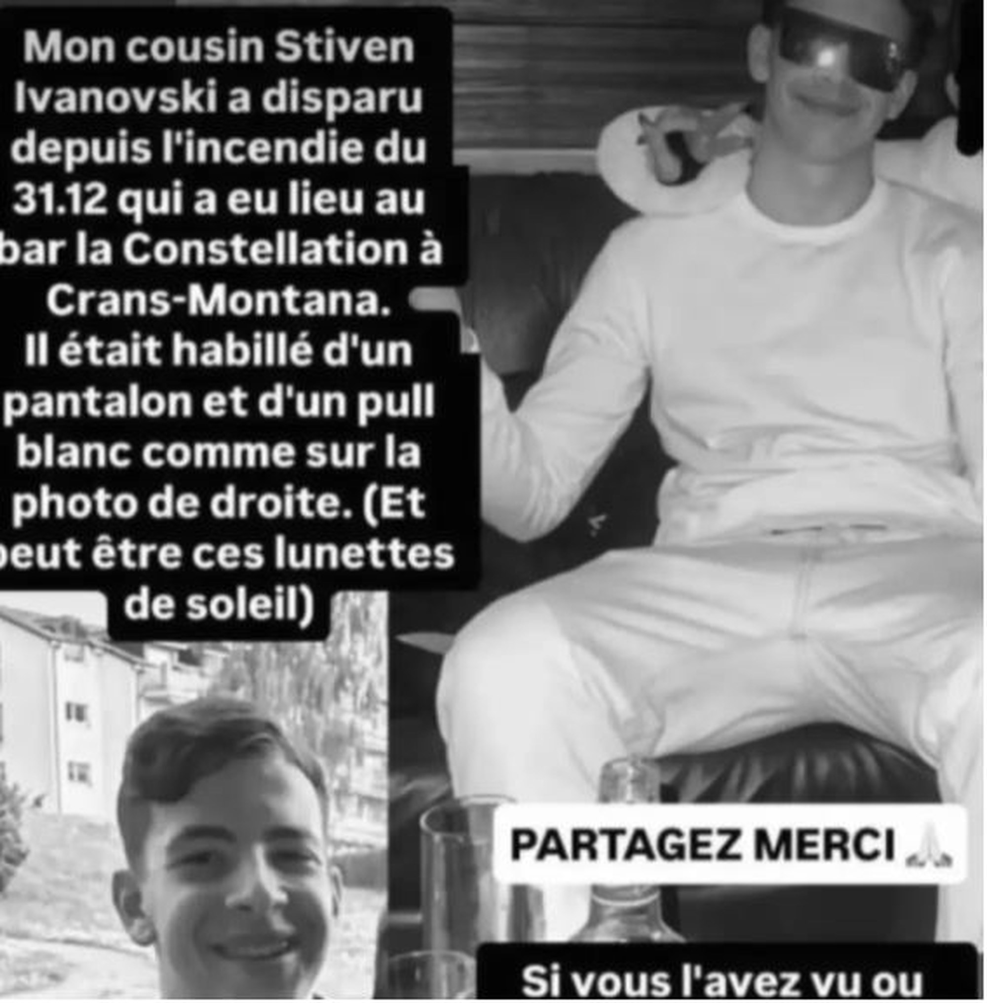 Στη λίστα των αγνοουμένων βρίσκεται και ο Stiven Ivanovski, ο οποίος φέρεται να εξαφανίστηκε πριν ξεσπάσει η φωτιά, περίπου δύο ώρες από τη Βέρνη. Η οικογένειά του περιέγραψε ότι φορούσε λευκό παντελόνι, λευκό πουλόβερ και πιθανώς γυαλιά ηλίου.