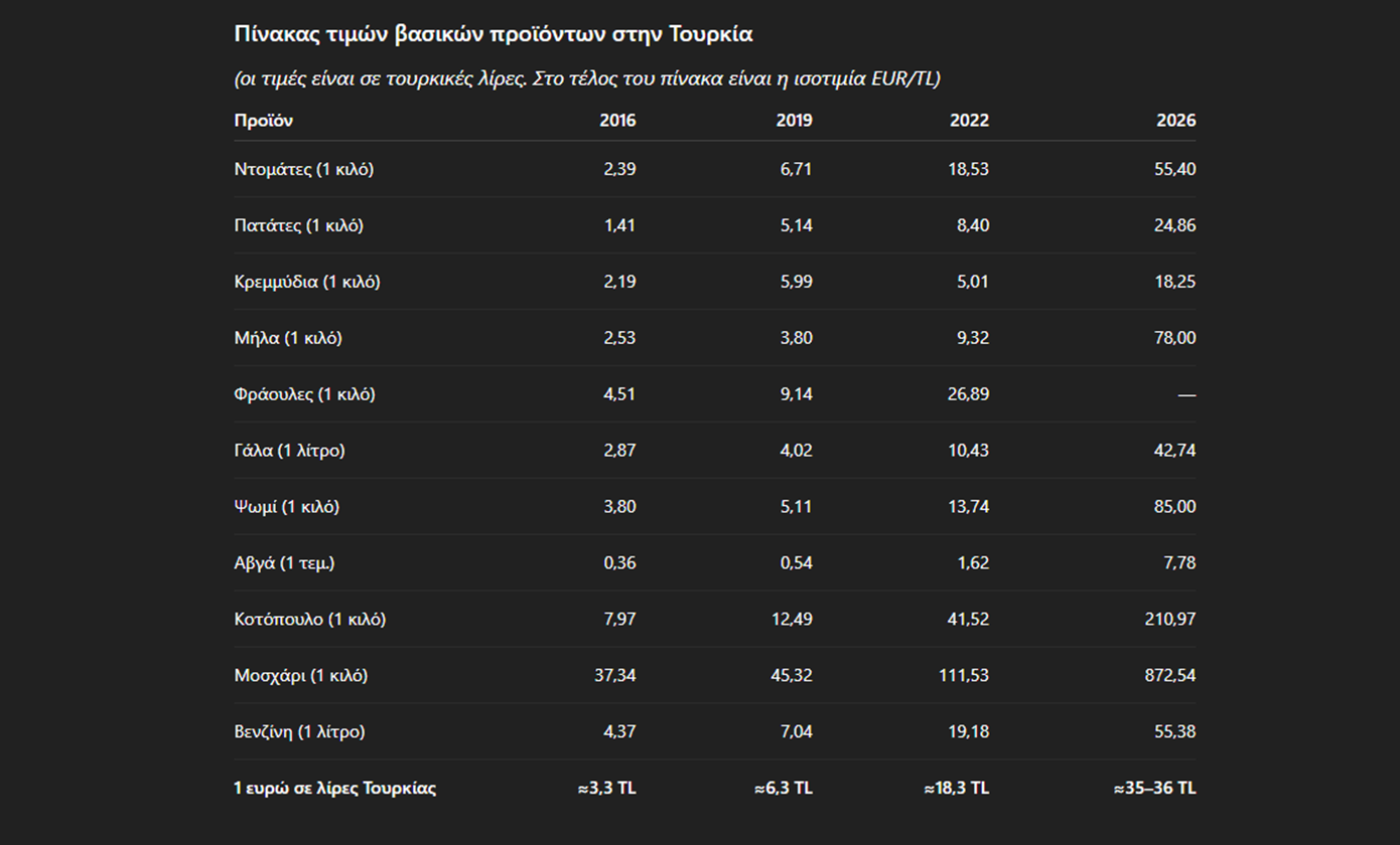 Το κρίσιμο συμπλήρωμα είναι η τελευταία γραμμή με την ισοτιμία EUR/TL, επειδή εξηγεί πώς η αύξηση σε λίρες «μεταφράζεται» σε απώλεια αγοραστικής δύναμης σε βάθος χρόνου. Όταν το 1 ευρώ κοστολογείται πολλαπλάσια σε λίρες σε σχέση με το 2016, η ακρίβεια στα τρόφιμα και στην ενέργεια δεν είναι μόνο θέμα τιμών ραφιού, είναι θέμα νομίσματος που πιέζει συνολικά το διαθέσιμο εισόδημα, ιδίως στα βασικά.