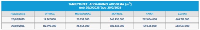 Απ: Τα αποθέματα της Παρασκευής 20 Φεβρουαρίου στους τέσσερις κύριους ταμιευτήρες της Αττικής (Μόρνος, Εύηνος, Υλίκη, Μαραθώνας) ανέρχονται σε περίπου 683,5 εκατ. κυβικά μέτρα. Η εικόνα είναι ελαφρώς βελτιωμένη σε σχέση με την αντίστοιχη περσινή περίοδο και αυτό οφείλεται στην πορεία των φετινών βροχοπτώσεων. Οι ιδιαίτερα αυξημένες βροχοπτώσεις στη Δυτική Στερεά Ελλάδα, ήδη από το φθινόπωρο, έδωσαν μια σημαντική "ανάσα", συμβάλλοντας στον ταχύτερο ρυθμό αναπλήρωσης των αποθεμάτων. Ενδεικτικά, στις περιοχές που τροφοδοτούν τους ταμιευτήρες Μόρνου-Ευήνου, τον Ιανουάριο σημειώθηκαν κατά τόπους ύψη βροχής υπερτριπλάσια του Ιανουαρίου 2025, ενώ για τον Φεβρουάριο οι καταγραφές δείχνουν ήδη ύψη ακόμα και πενταπλάσια από τα περσινά. Αυτό σημαίνει ότι για το επερχόμενο καλοκαίρι δεν αναμένεται άμεσος κίνδυνος για την υδατική μας επάρκεια.