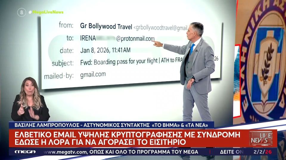 Πιο αναλυτικά, ο Βασίλης Λαμπρόπουλος είπε στο Live News πως το email που έδωσε η ανήλικη ώστε να βγάλει το εισιτήριό της είναι από ελβετική εταιρεία, η οποία είναι ηλεκτρονική υπηρεσία κρυπτογραφημένης αποστολής και λήψης email που προσφέρει υψηλό επίπεδο ιδιωτικότητας και ασφάλειας για τα μηνύματα των χρηστών, η οποία λειτουργεί με πληρωμή.