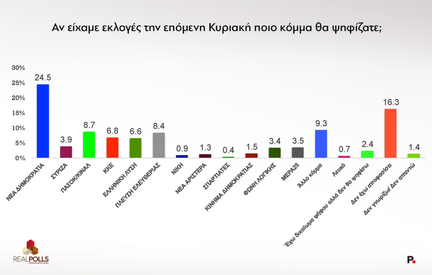 Η RealPolls πραγματοποίησε νέα δημοσκόπηση, με τις απαντήσεις να δίνουν πρώτη τη Νέα Δημοκρατία και με σημαντική διαφορά, ενώ η Ζωή Κωνσταντοπούλου πλησιάζει το ΠΑΣΟΚ στη δεύτερη θέση. Παράλληλα, τέθηκε και ερώτημα για τη Μαρία Καρυστιανού και τον Αλέξη Τσίπρα.