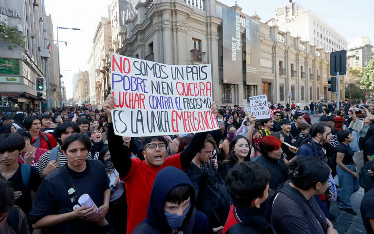 Οι διαδηλωτές, πολλοί από τους οποίους ήταν και μαθητές με σχολικές στολές, παρέλασαν μπροστά από το προεδρικό μέγαρο στην πρωτεύουσα Σαντιάγο, κρατώντας πινακίδες με μηνύματα όπως «Anti-Kast» με μια σβάστικα στη θέση του S.