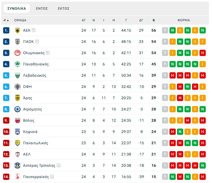 Με την ΑΕΚ στην κορυφή της βαθμολογίας με 56 βαθμούς και τον Ολυμπιακό με τον ΠΑΟΚ να ισοβαθμούν στη δεύτερη θέση με 54 πόντους θα ολοκληρωθεί η 24η αγωνιστική της Super League.