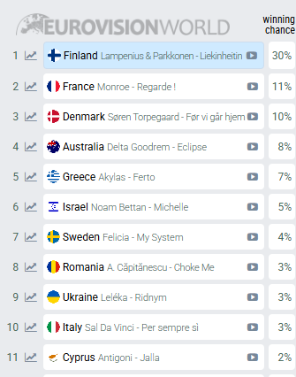 Στην κορυφή των προγνωστικών παραμένει αμετακίνητη η Φινλανδία. Το τραγούδι «Liekinheitin» θεωρείται το απόλυτο φαβορί με ποσοστό νίκης που αγγίζει το 30%.
